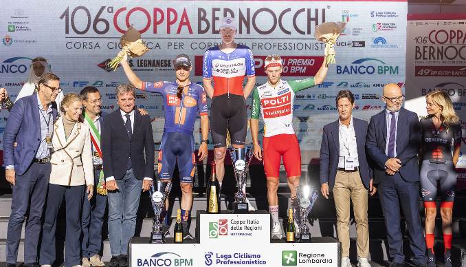 Dorian Godon (Decathlon-AG2R La Mondiale Team), Tricolore di Francia vince a Legnano la 106° edizione della Coppa Bernocchi valida anche per l’assegnazione del 49° GP Banco BPM, gara organizzata dall’US Legnanese 1913 presieduta da Luca Roveda sul classico percorso imperniato sulla salita del “Piccolo Stelvio” con 157 corridori schierati sulla linea di partenza per pedalare sui 191,600 chilometri del percorso suddiviso in tre tratti, il primo un percorso di 19 km nei dintorni di Legnano per contendersi i traguardi volanti di Parabiago, vinto da Xabier Mikkel Azparenn (Q36.5), in successione quello di Nerviano al km 7,2 vinto da Ethan Hayter (Sudal Quick Step) e il terzo ed ultimo di Cerro Maggiore vinto da Gianni Vermeersch (Alpecin Deceunink).