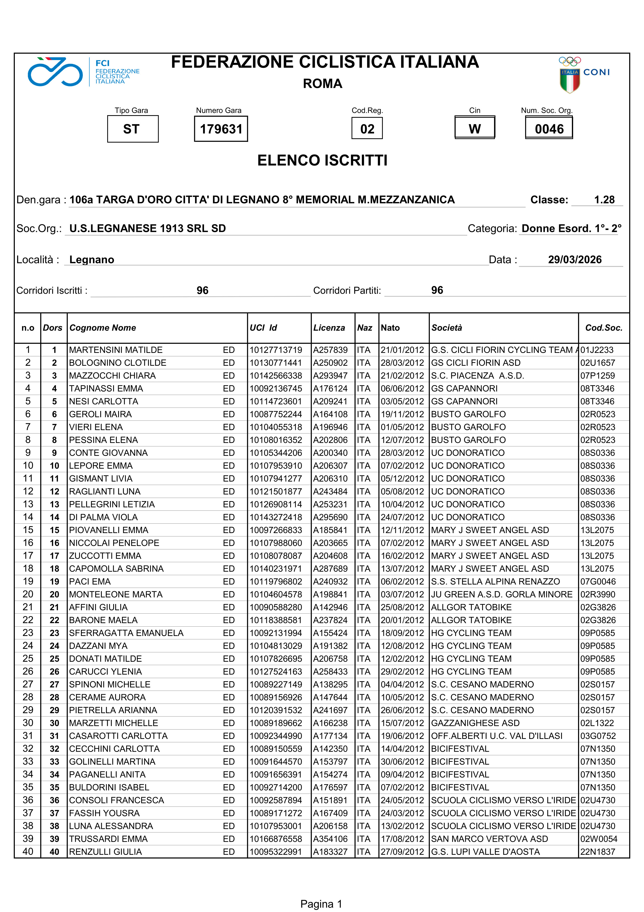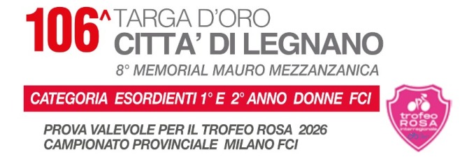 Sono 47 le Atlete Donne Esordienti classe 2012 (al 2° anno nella categoria) che domenica si affronteranno sul circuito predisposto dai Dirigenti dell’US Legnanese 1913 per la disputa della 106° edizione della Targa D’Oro Città di Legnano gara valida anche per l’assegnazione dell’8° Memorial Mauro Mezzanzanica, i punteggi per il Trofeo Rosa ma anche la Maglia di Campionesse Provinciali di Milano per le Donne Esordienti al 1° anno e per le 38 Atlete della classe 2013 (1° anno).