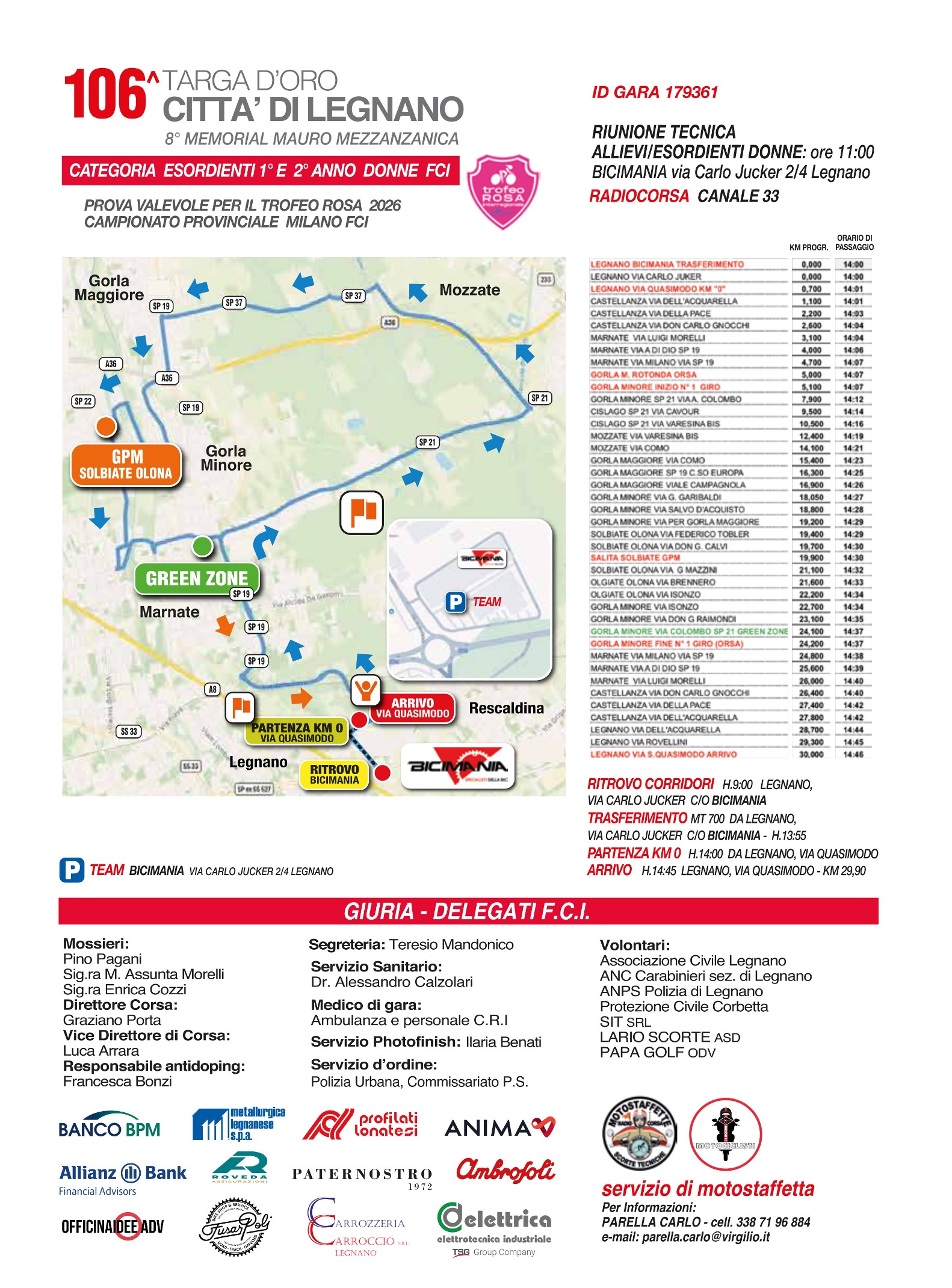 Circuito identico per tutte le categorie in gara, come anche il GPM che verrà conteggiato sull’erta di Solbiate Olona ad ogni passaggio.