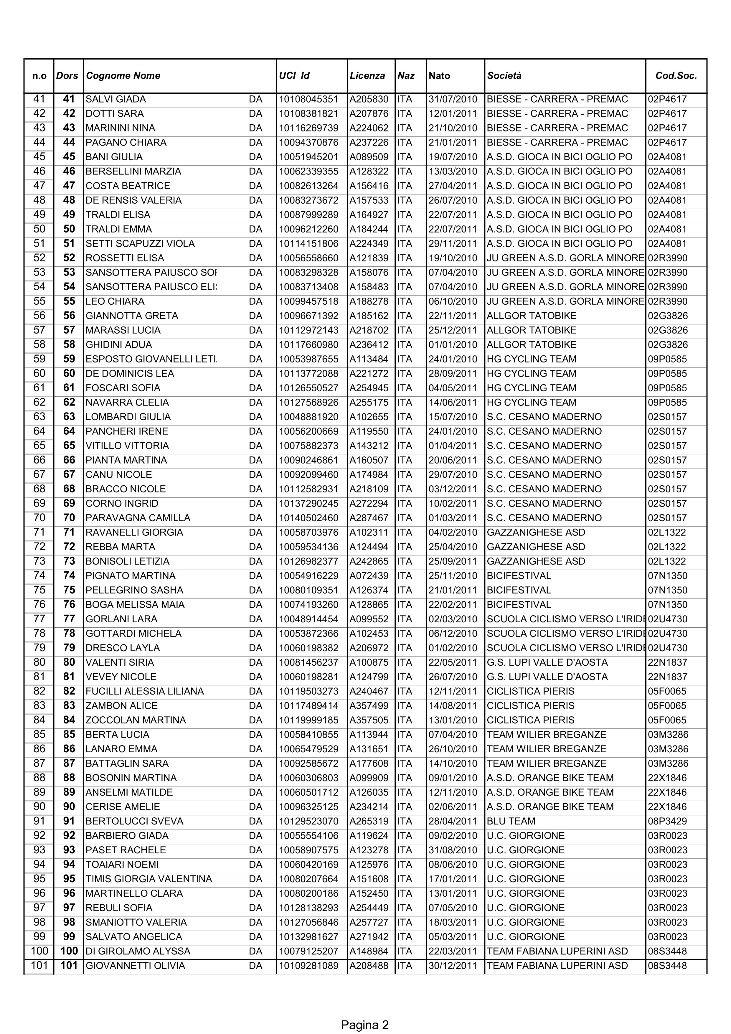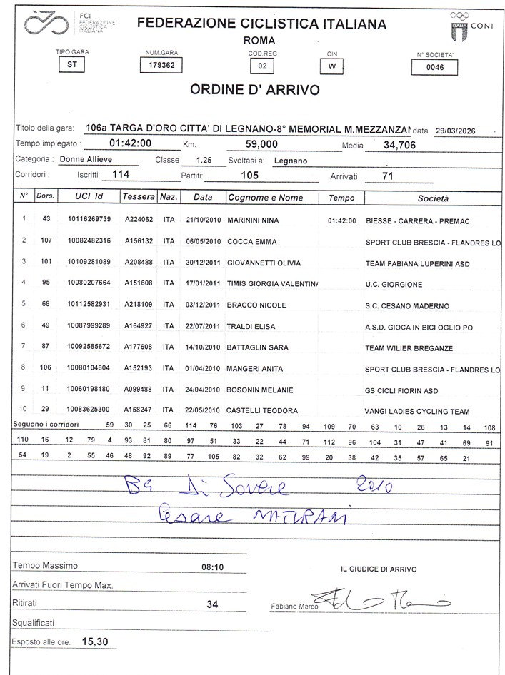 1) Nina Marinini (Biesse Carrera-Premac) km 59,00 in 1h42’ media kmh. 34,706; 2) Emma Cocca (Sport Club Brescia-Flandres Lova); 3) Olivia Giovannetti (Team Fabiana Luperini); 4) Valentina Giorgia Timis (UC Giorgione); 5) Nicole Bracco (Cesano Maderno); 6) Elisa Traldi (Gioca in Bici-Oglio Po); 7) Sara Battaglin (Team Wilier Breganze); 8) Anita Mangeri (Sport Club Brescia-Flandres Love); 9) Melanie Bosonin (Fiorin); 10) Teodora Castelli (Vangi Ladies-Cycling Team).-