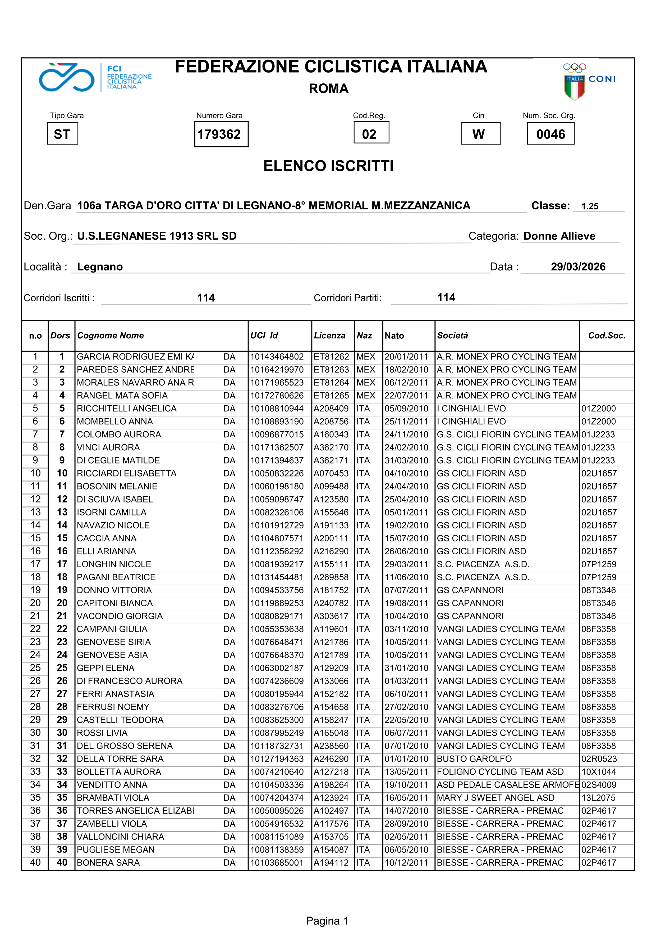 Prima vittoria stagionale per la Donna Allieva Nina Marinini (Biesse Carrera-Premac), sedici anni, bergamasca di Sovere guidata in ammiraglia dal DS Cesare Naturani che piazza uno sprint da antologia precedendo a Legnano sul traguardo della 106° Targa d’Oro Città di Legnano-8° Memorial Mauro Mezzanzanica l’altrettanto veloce Emma Cocca (Sport Club Brescia) e la toscana Olivia Giovannetti (Team Luperini) che completa il podio di giornata.