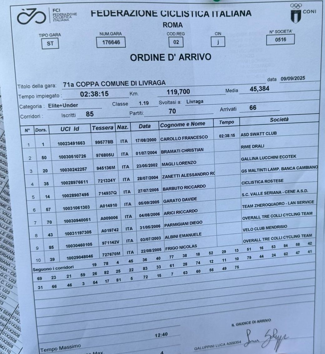 Una gara onorata alla grande anche dai corridori che su 70 partenti in 66 hanno portato a termine la competizione di km 119.7 alla media di kmh 45.384.