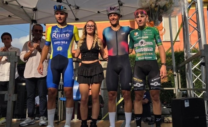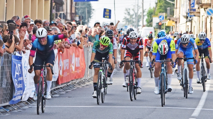 Conclusione della gara con uno sprint di gruppo che ha visto prevalere Francesco Carollo dello Swatt Club la stessa squadra che ha giugno ha avuto l’onore di vincere il Campionato Italiano Professionisti su strada con Filippo Conca degnissimamente fasciato con la Maglia Tricolore.