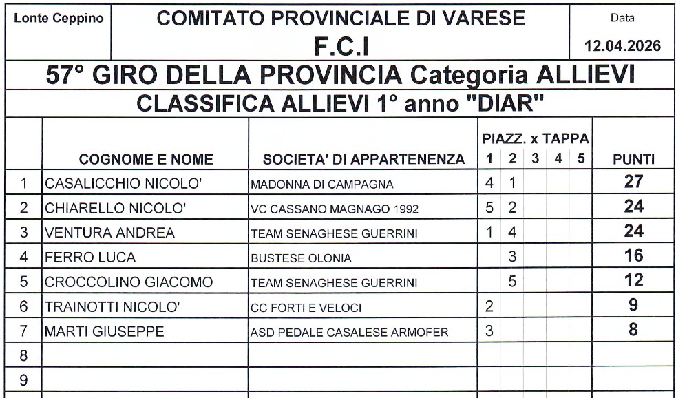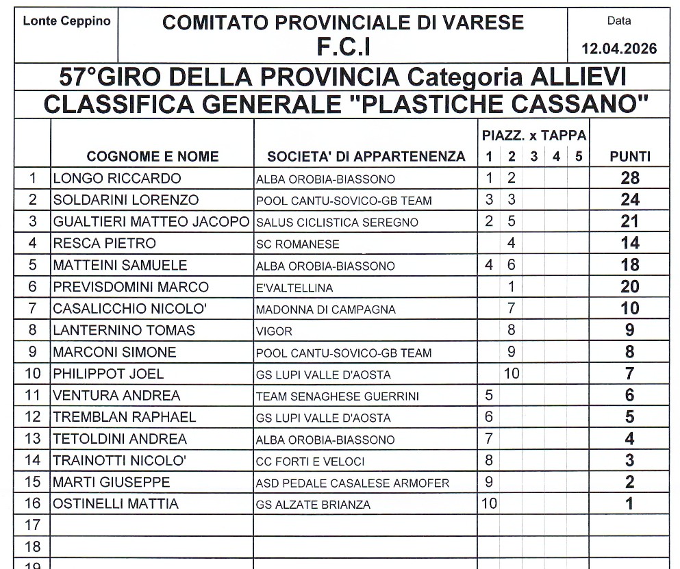 –57° Giro della Provincia Classifica Generale “Plastiche Cassano”, 1) Riccardo Longo (Alba Orobia Biassono) punti 28; 2) Lorenzo Soldarini (Pool Cantù-Sovico-GB) 24; 3) Jacopo Matteo Gualtieri (Salus), 21. Classifica 1° anno “DIAR, 1) Nicolò Casalicchio (Madonna di Campagna) punti 27; 2) Nicolò Chiarello (Cassano M), 24; 3) Andrea Ventura (Senaghese Guerrini) 24; 4) Luca Ferro (Bustese O), 16.