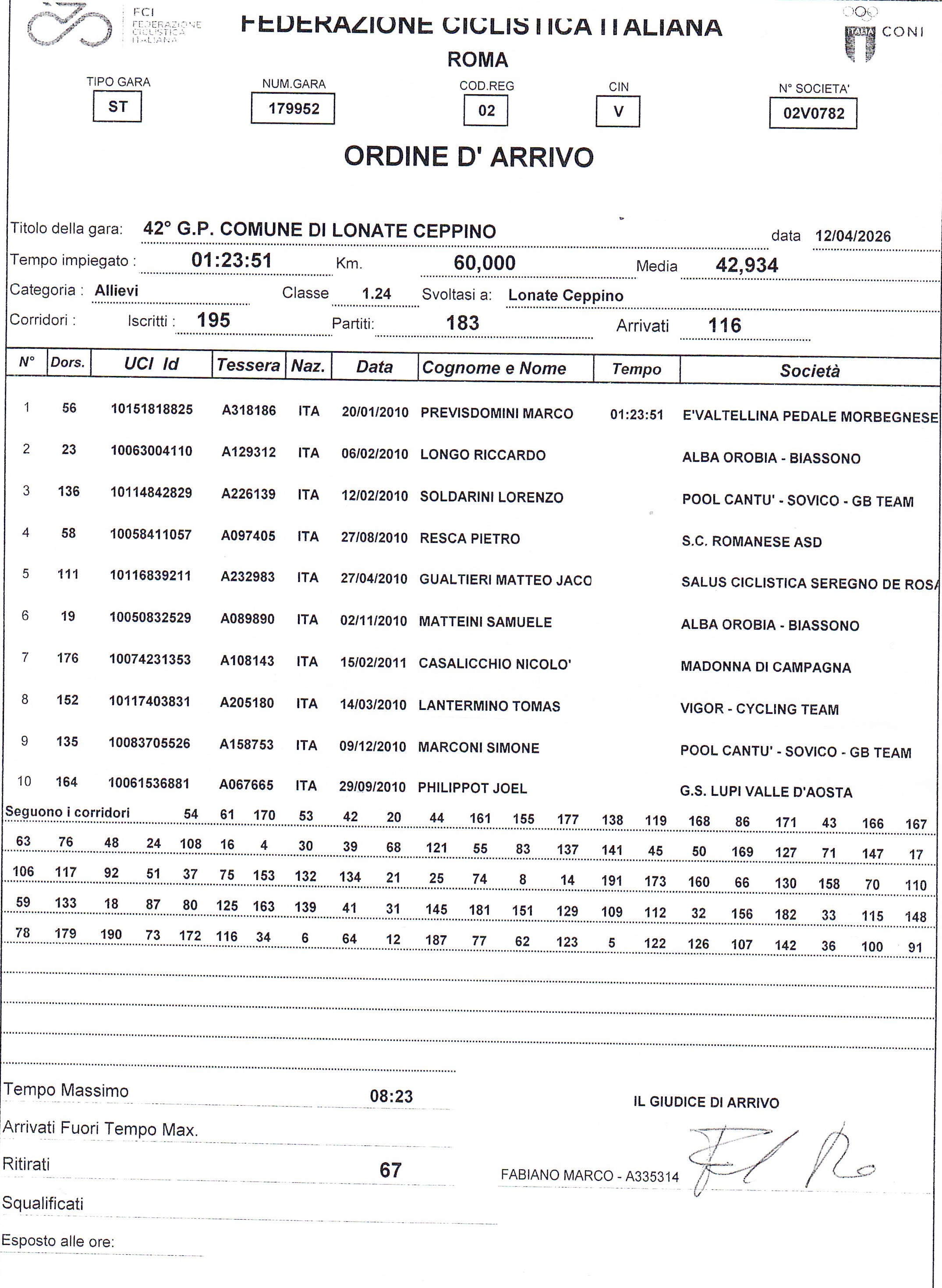 1) Marco Previsdomini (E’ Valtellina-Pedale Morbegnese) km. 60,00 in 1h23’51” media kmh. 42,934; 2) Riccardo Longo (Alba Orobia Biassono); 3) Lorenzo Soldarini (Pool Cantù-Sovico-GB Team); 4) Pietro Resca (SC Romanese); 5) Jacopo Matteo Gualtieri (Salus Ciclistica Seregno – De Rosa); 6) Samuele Matteini (Alba Orobia-Biassono); 7) Nicolò Casalicchio (SC Madonna di Campagna); 8) Tomas Lanternino (Vigor Cycling Team); 9) Simone Marconi (Pool Cantu-Sovico-GB Team): 10) Joel Philippot (GS Lupi Valle D’Aosta).