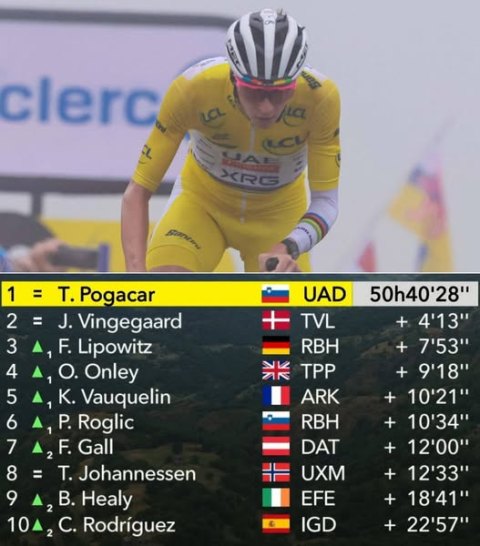 E anche questa tappa è stata nettamente controllata dal Campione del Mondo Tadej Pogacar che teneva d’occhio il suo rivale numero uno Jonas Vingegaard che, in classifica generale lo segue a oltre 4 minuti.
