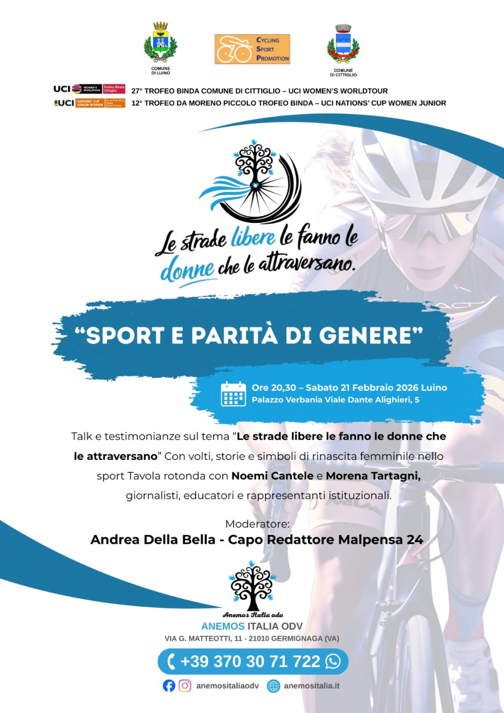 L’importante manifestazione si terrà sabato 21 febbraio 2026 a Luino nel Palazzo Verbania in via Dante Alighieri,5 con inizio alle ore 20,30 dal titolo : “Le Strade Libere le fanno le Donne che le Attraversano” all’insegna dello Sport e la parità di genere.
