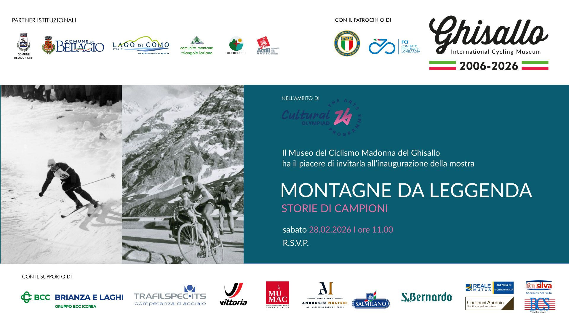Magreglio, Como – 16 02 26 – Dal 28 febbraio al 5 aprile 2026 il Museo del Ciclismo Madonna del Ghisallo inaugura la nuova stagione riaprendo con la mostra temporanea «Montagne da leggenda. Storie di campioni» un percorso espositivo che mette in dialogo gli scenari del ciclismo con quelli degli sport invernali, accesi dall’edizione 2026 dei Giochi Olimpici e Paralimpici Invernali. La mostra è entrata a far parte dell’Olimpiade Culturale di Milano Cortina 2026, programma culturale dei Giochi, ed è a tutti gli effetti un’iniziativa culturale inserita nel ricco palinsesto olimpico.