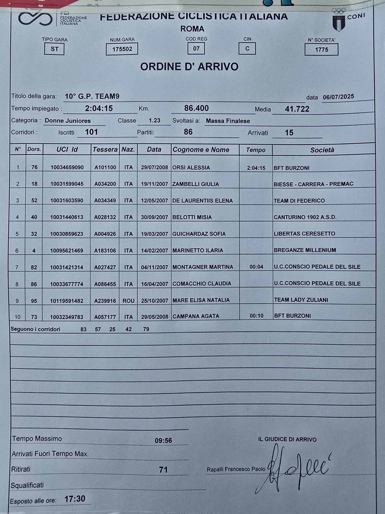 Classifica Donne Juniores Massa Finalese: