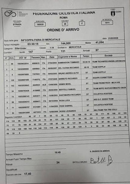 Mercatale Valdarno,31 marzo 2026 – La 64^ Coppa Fiera di Mercatale Valdarno per élite e under 23, una delle corse regionali dal passato più prestigioso, su di un percorso inedito per ragioni di viabilità, è stata firmata quest’anno dal grossetano Tommaso Bambagioni della Technipes InEmiliaRomagna autore di una finale splendido. Reduce dalla Settimana Internazionale Coppi e Bartali (ottenne l’ottavo posto nella prima tappa conclusasi a Barolo) Bambagioni con una progressione fantastica ha lasciato tutti presentandosi da solo sul traguardo in salita di Mercatale Valdarno. Per Bambagioni, classe 2005, si è trattato della sua prima vittoria tra gli under 23, mentre sono diversi i piazzamenti che Tommaso ha conquistato in carriera con diverse esperienze anche nelle gare dei professionisti.