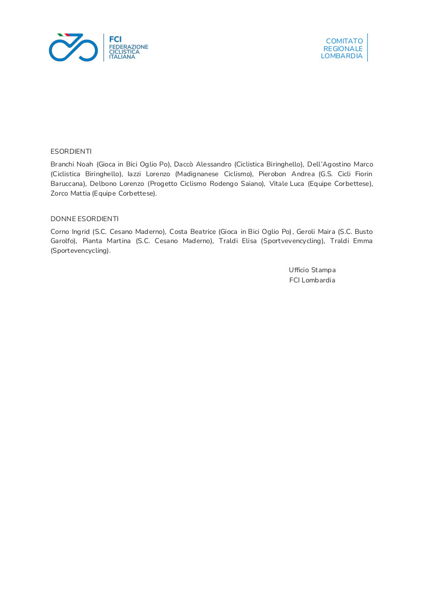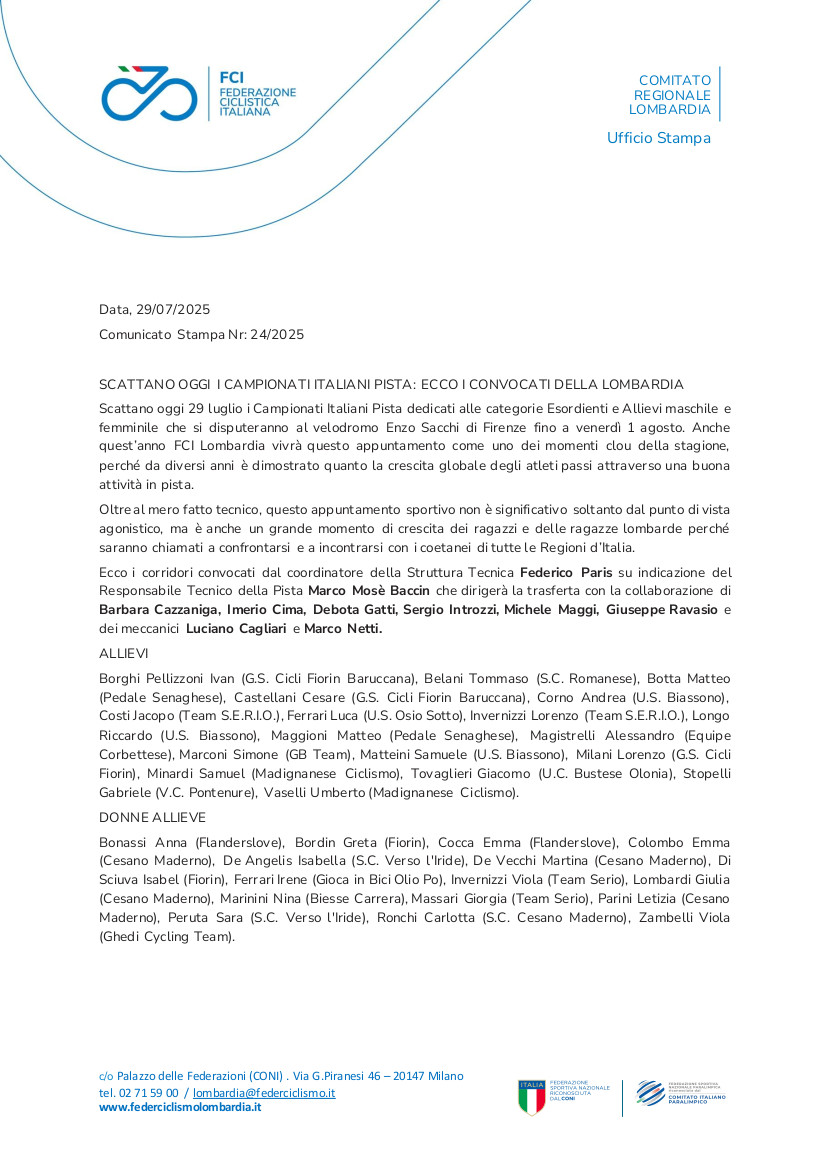 Elenco Atleti convocati partecipazione Tricolori Pista Firenze