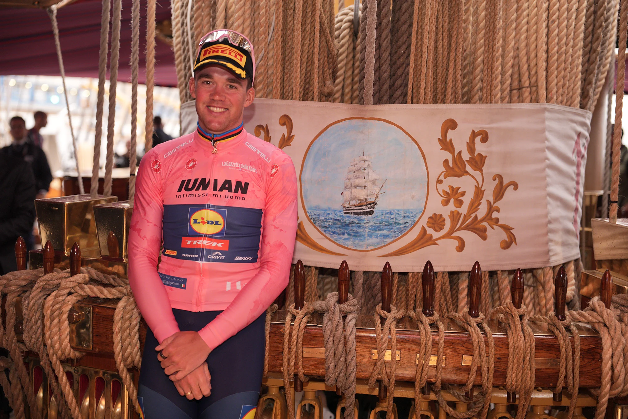 Da sinistra, Comandante di Nave Vespucci Giuseppe Lai, AD di Difesa Servizi Luca Andreoli, Sottocapo di Stato Maggiore della Marina Militare Giuseppe Berutti Bergotto, AD RCS Sport Paolo Bellino, Ministro dell’agricoltura, della sovranità alimentare e delle foreste Francesco Lollobrigida, la Maglia Rosa Mads Pedersen, Ministro dello sport Andrea Abodi, viceministro agli affari esteri e alla cooperazione internazionale Edmondo Cirielli, Presidente ICE Matteo Zoppas, Sottosegretario di Stato alla Difesa Matteo Perego di Cremnago.