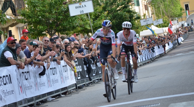Pochissimi chilometri all’arrivo, 4…3…2 il vantaggio è risicatissimo, poco più di una ventina di secondi ma, ormai è fatta e quando Nespoli proprio davanti al Palazzo Comunale svolta a destra, vede lo striscione del traguardo a meno di 500 metri.