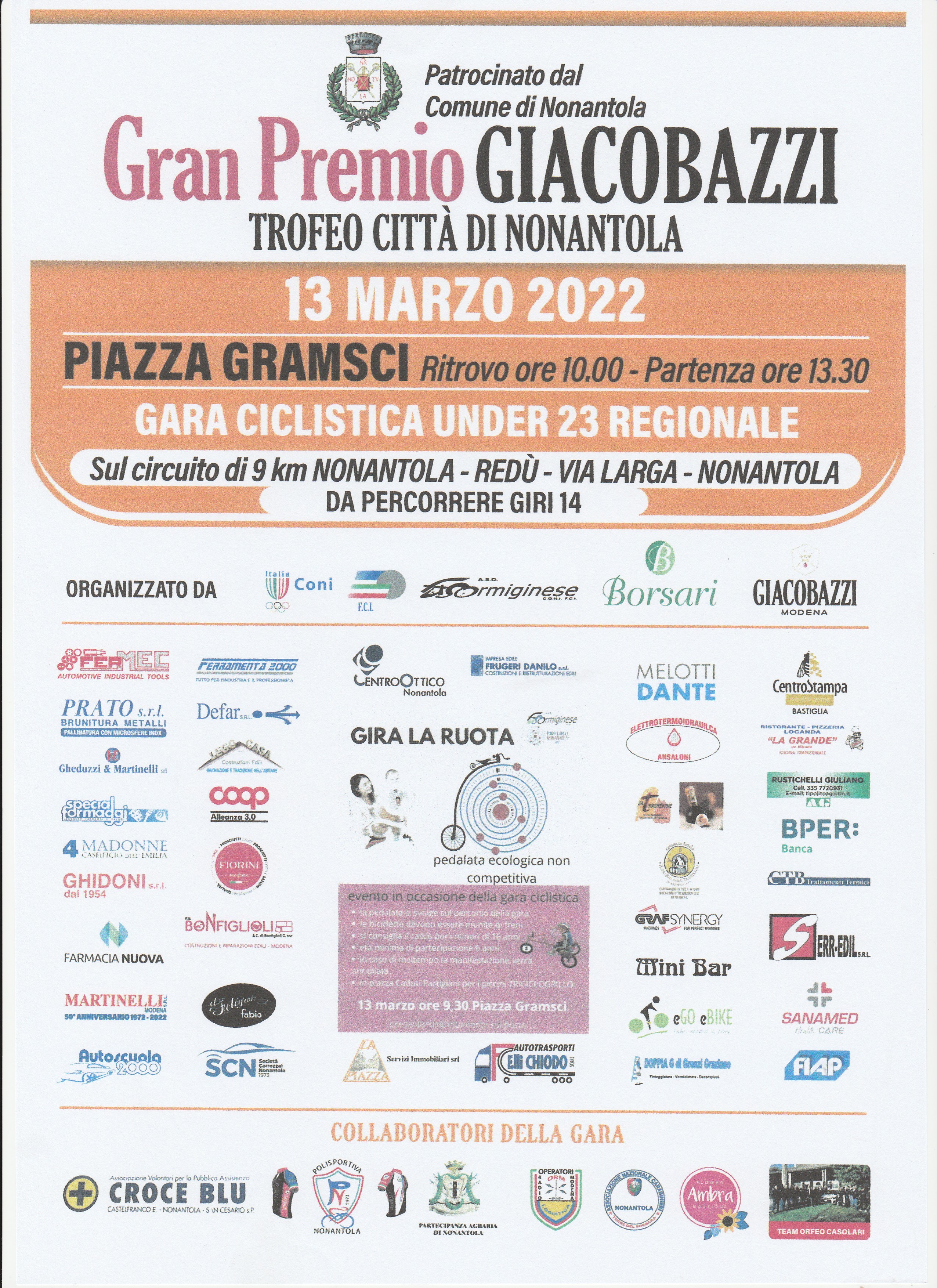 Torna a Nonantola il grande ciclismo col Trofeo Città di Nonantola-Gran Premio Giacobazzi, un nome che ha fatto la storia del grande ciclismo con uno squadrone che ha lanciato nel mondo del ciclismo a livello professionistico, fior di Campioni, uno per tutti, il Pirata Marco Pantani.