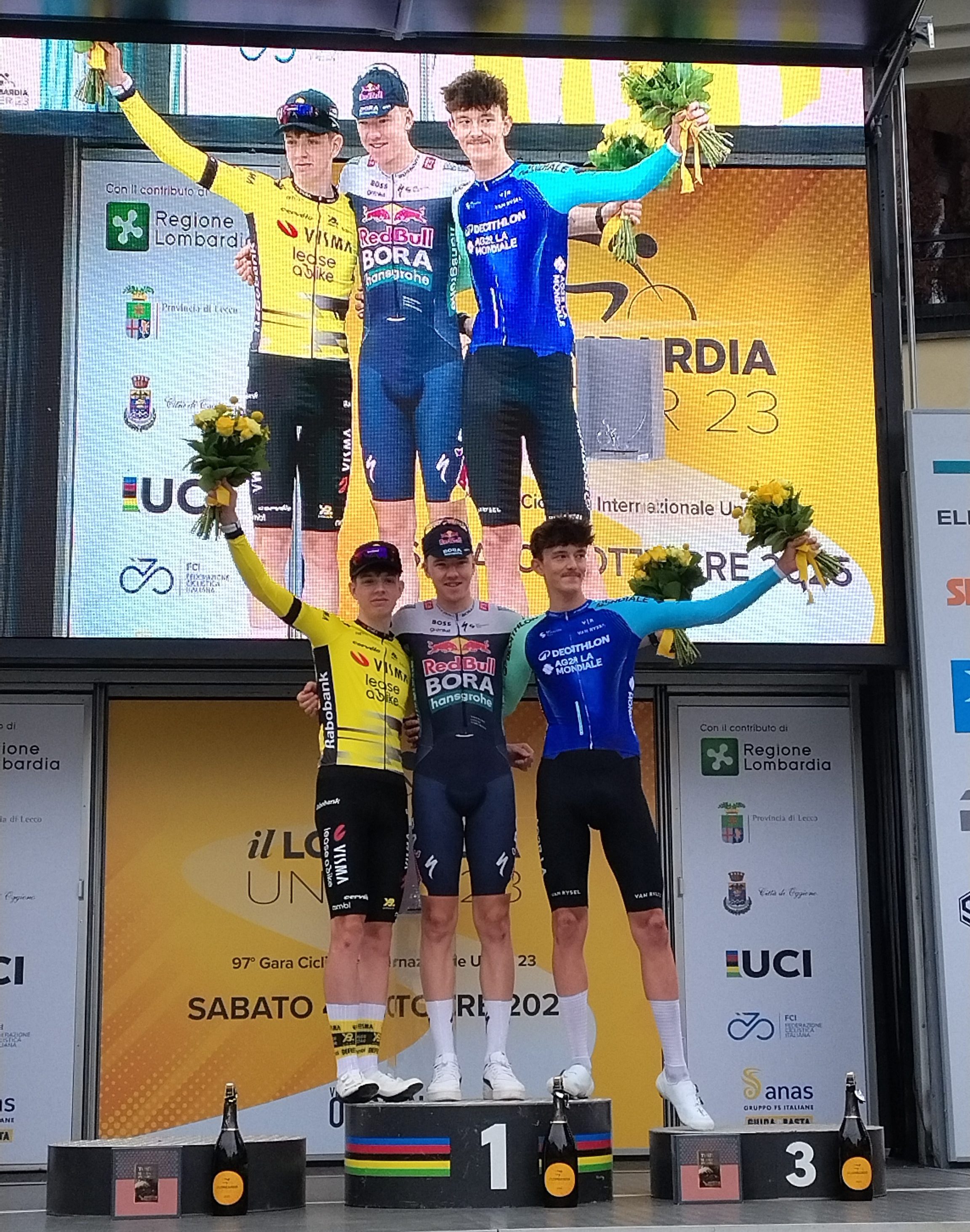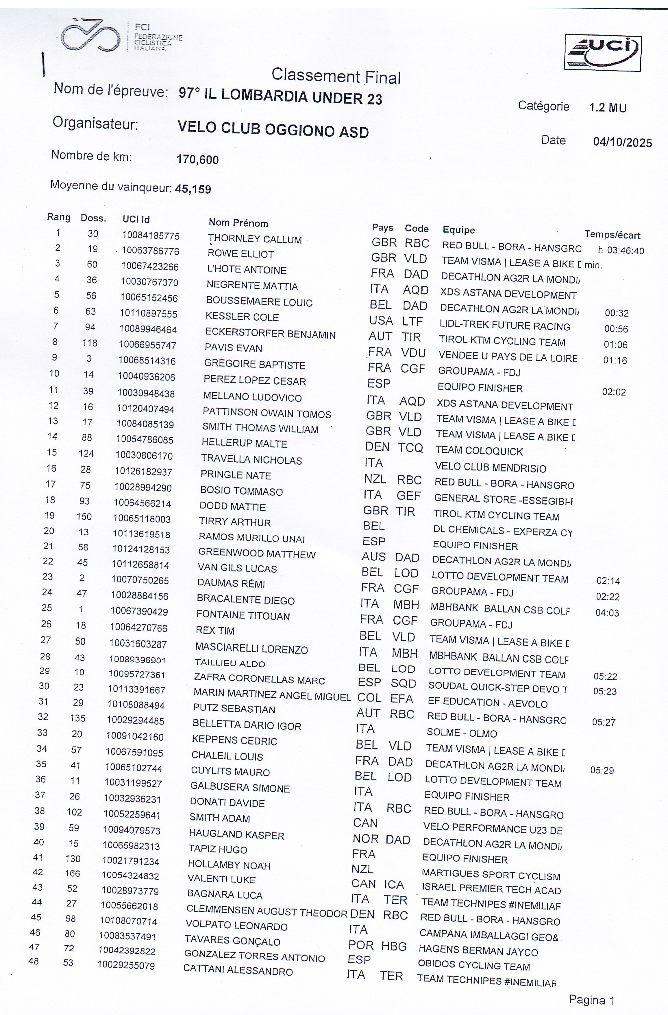 Callum Thornley, (Red Bull-Bora-Hansgroe, 22 anni, scozzese di Edimburgo, 5° classificato ai recenti campionati mondiali crono individuale di Kigali (Rwanda) vince ad Oggiono nel lecchese, la 97° edizione de “Il Lombardia Under 23” impostando una volata “chirurgica” per lo spazio assai ristretto tra lui ed Elliot Rowe (Gbr-Team Visma Lease a Bike Development) che ha dovuto accontentarsi del posto d’onore mentre il francese Antoine L’Hote (Decathlon AG2R-La Mondiale-Developpment) ha completato il podio col veronese Mattia Negrente (XDS Astana-Developpment), premiato come corridore più combattivo resta ai piedi del podio.