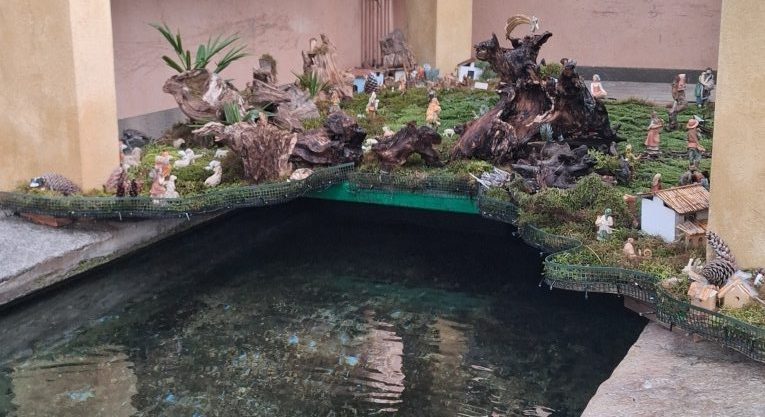 Sono circa cinquanta le statue che ornano il Presepe che sembra galleggiare sull’acqua in uno scenario unico.