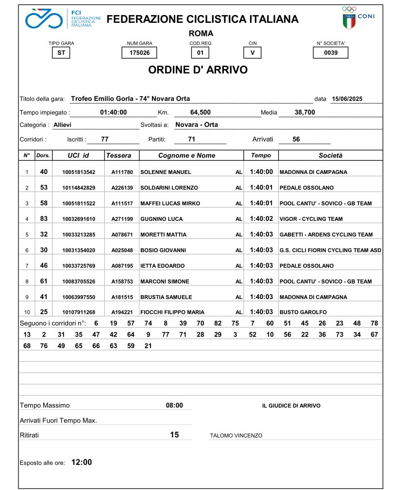 Manuel Solenne è alla sua prima vittoria stagionale, originario del Canavese gareggia sotto le insegne della Squadra torinese “S.C. Madonna di Campagna” diretto in Ammiraglia del Direttore Sportivo Vladimir Chiumatto.