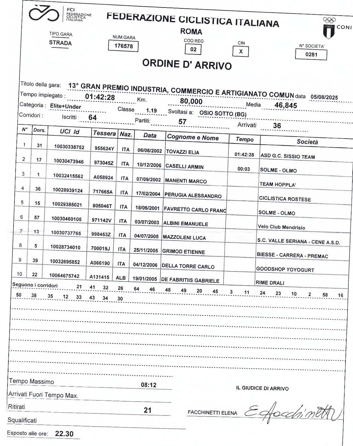 1)Elia Tovazzi (GC Sissio Team) km 80,00 in 1h42’28” media kmh. 46,845;
