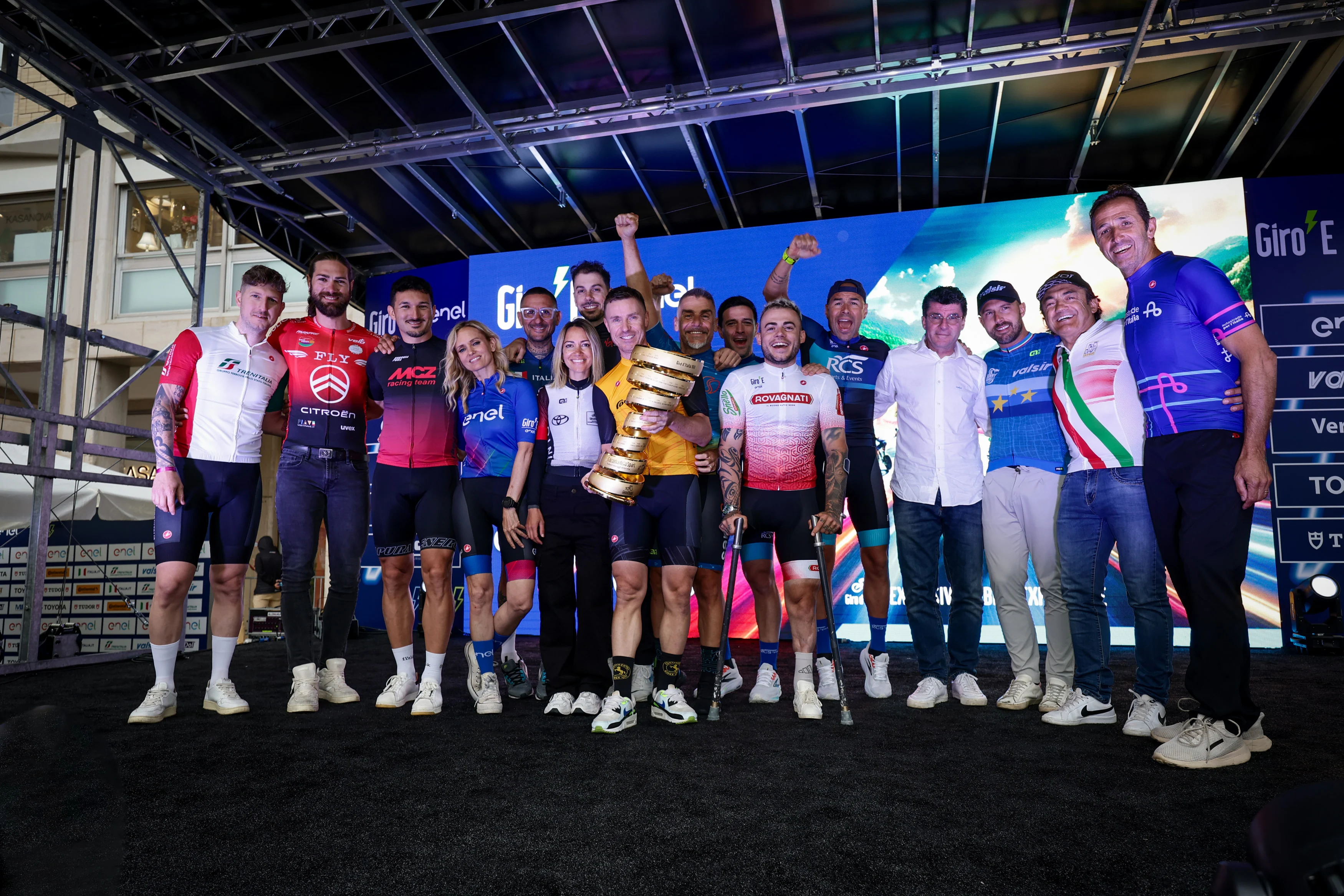 La prima tappa è stata preceduta, la sera dell’11 maggio al Green Fun Village by Continental allestito a Lecce e inaugurato in una piazza gremita da 11mila persone con la performance del dj e producer Federico Scavo, dalla Teams Presentation, un altro dei momenti mutuati dal cerimoniale del Giro d’Italia. Sul palco tutti i capitani, i team manager e naturalmente le bici a pedalata assistita del Giro-E Enel 2025: campioni Gianni Bugno (Valsir), Claudio Chiappucci (ANCI), Igor Astarloa (Valsir), Damiano Cunego (Continental), Andrea Tafi (Autostrade per l’Italia), gli ex professionisti Marco Canola (Virgin Active), Sacha Modolo (Trenitalia), Marco Benfatto (MCZ), Alessandro Spezialetti (Tudor), e poi Justine Mattera (Enel), Elisa Scarlatta (Toyota), Amedeo Tabini (Fly Cycling Citroën), Lello Ferrara (Italia.it), Emiliano Cantagallo (Sara Assicurazioni), Andrea Pusateri (Rovagnati), Maurizio Formichetti (Regione Abruzzo), Giuseppe Bica (RCS Sport), Umberto Carfora (RCS Sport & Events).