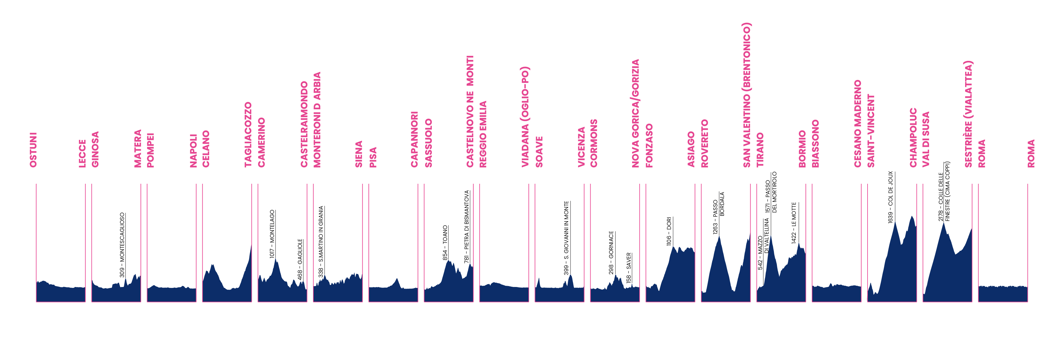 Quella odierna sarà la tappa più lunga dell’edizione 2025. La più corta sarà la numero 7, da Capannori a Pisa: appena 31 chilometri. Nella terza settimana ci saranno ben tre tappe con un dislivello superiore ai 2mila metri: Rovereto-San Valentino 2.400 metri, Tirano-Bormio 2.100 metri, Susa-Sestriere 2.400 metri; ma c’è anche la Saint Vincent-Champoluc di 1.850 metri.