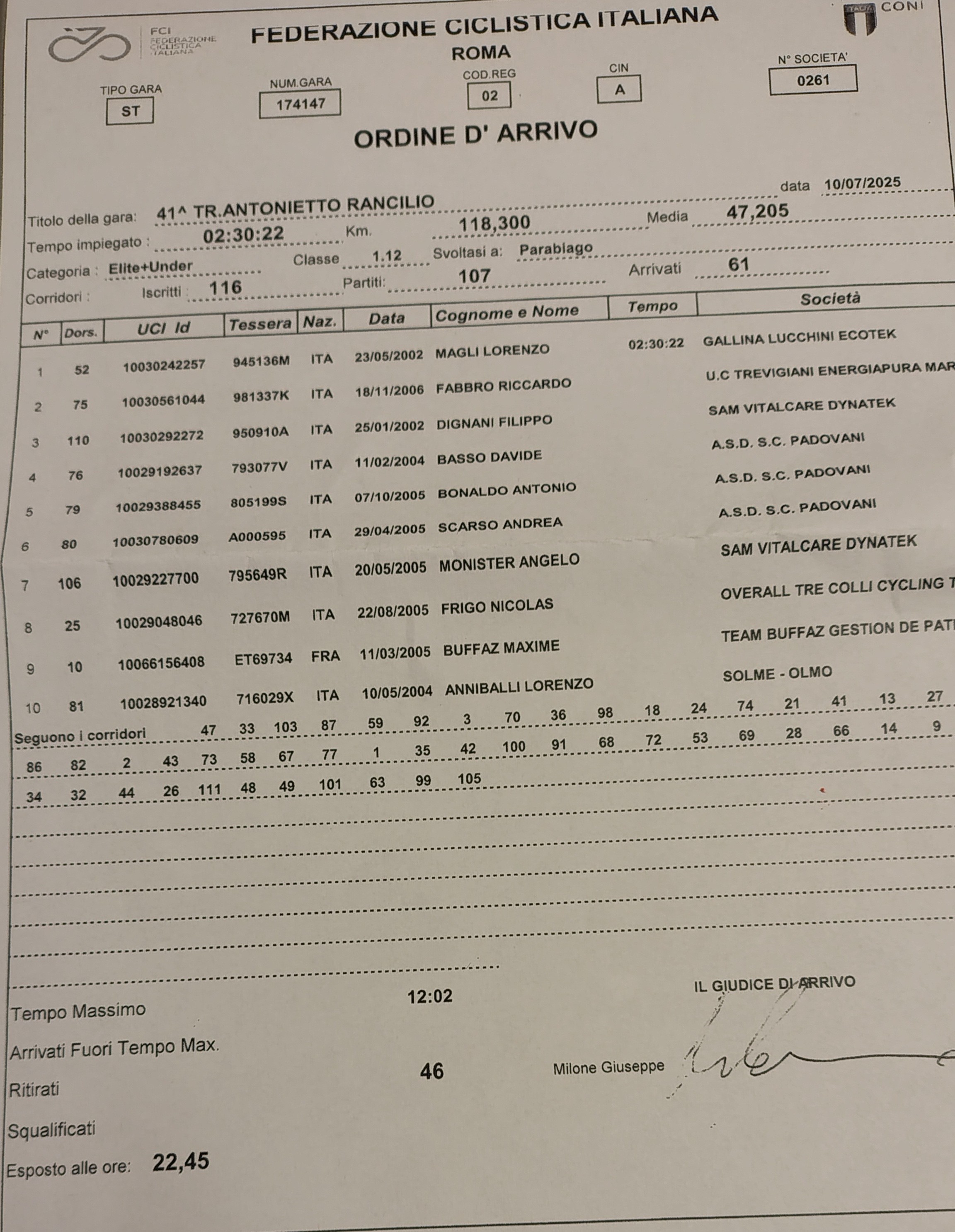 Nell’ultimo chilometro scoppia la bagarre e al colpo di reni decisivo si confrontano Lorenzo Magli e Riccardo Fabbro che il fotofinish classifica al posto d’onore seguito da Filippo Dignani che completa il podio di giornata.