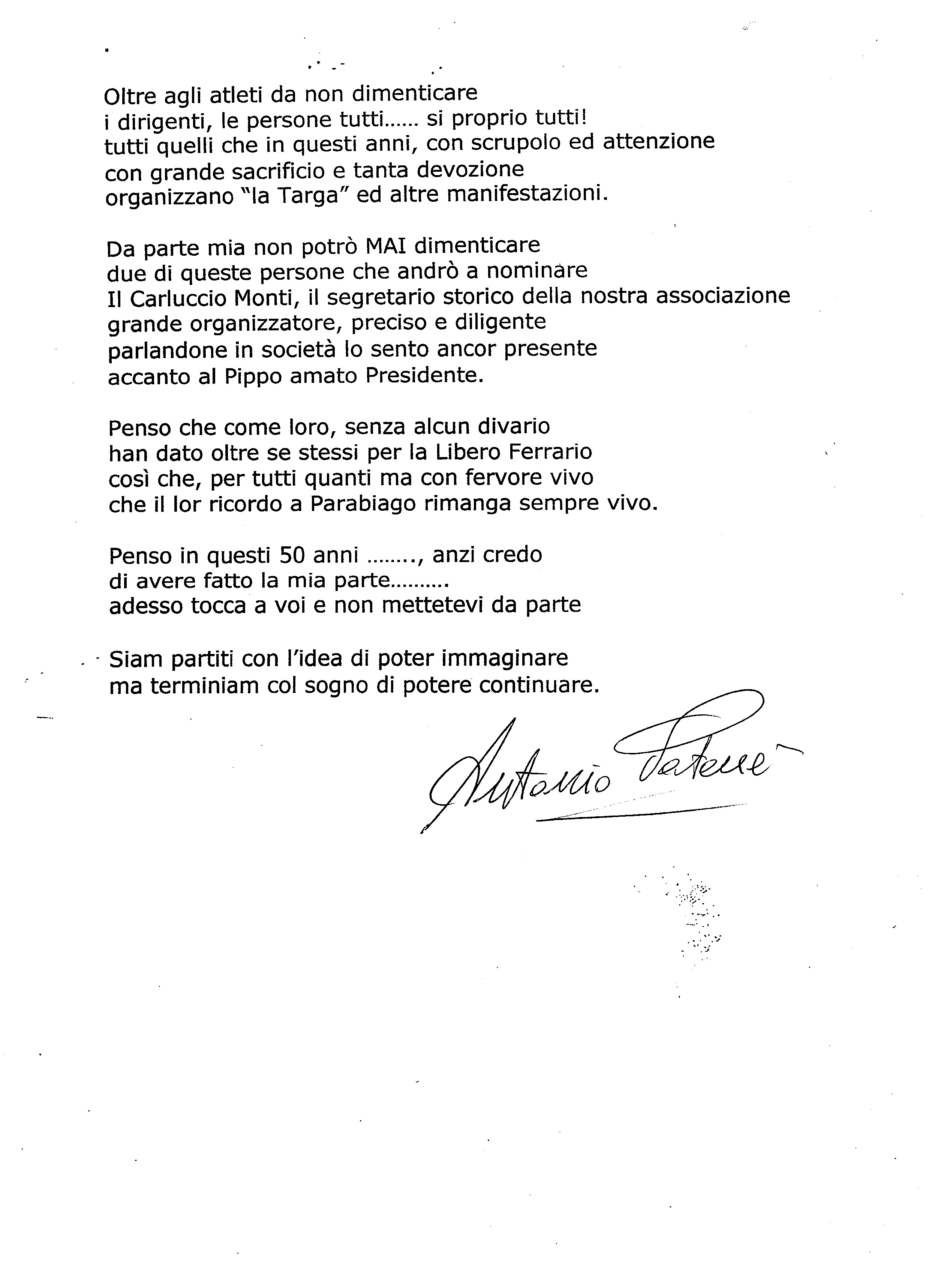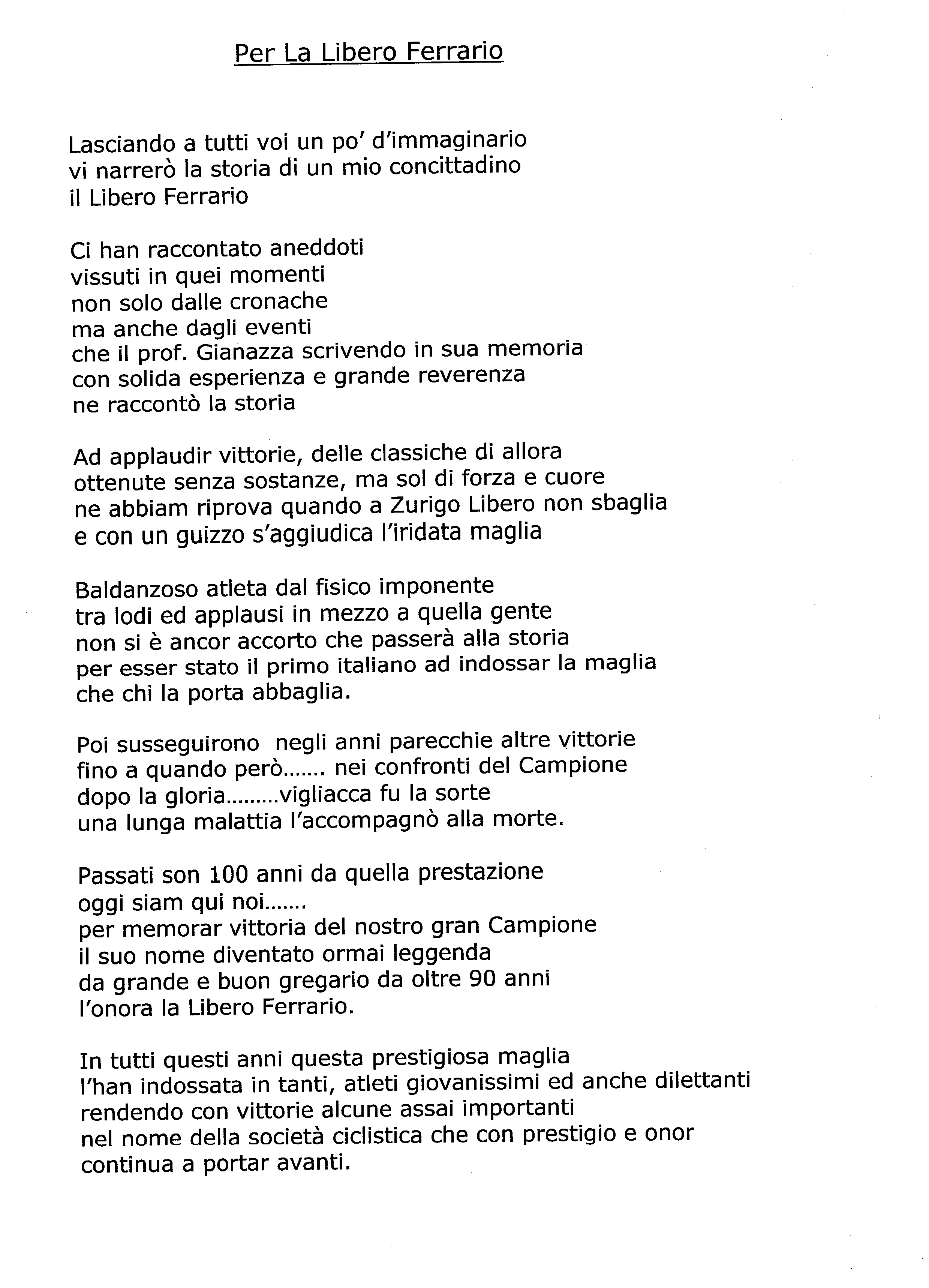 Dei premiati abbiamo già parlato in un articolo su questo stesso sito e tutto dedicato ad Antonio Patanè con la pubblicazione della meravigliosa poesia che ha voluto dedicare alla Libero Ferrario in occasione anche dei suoi “primi 50 anni” di iscrizione e collaborazione con la Società Ciclistica che porta ed onora il nome di “Bucicchio” come veniva amorevolmente chiamato Libero Ferrario.