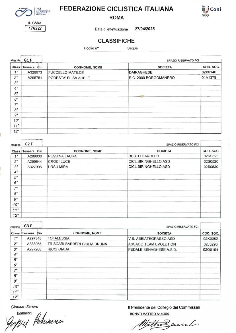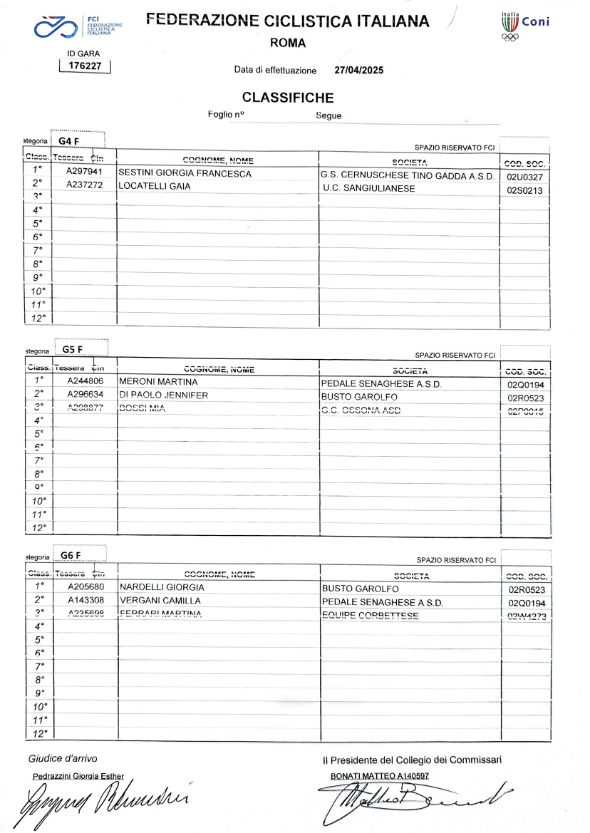 Sei gare con 5 Società diverse a salire sul primo gradino del podio con la SC Busto Garolfo 1954 che si è imposta tra le G2 e le G6 mentre le altre gare rispettivamente all’US Dairaghese (G1); al Velo Sport Abbiategrasso (G3), al GS Cernuschese-Tino Gadda) (G4) e al Pedale Senaghese (G5)