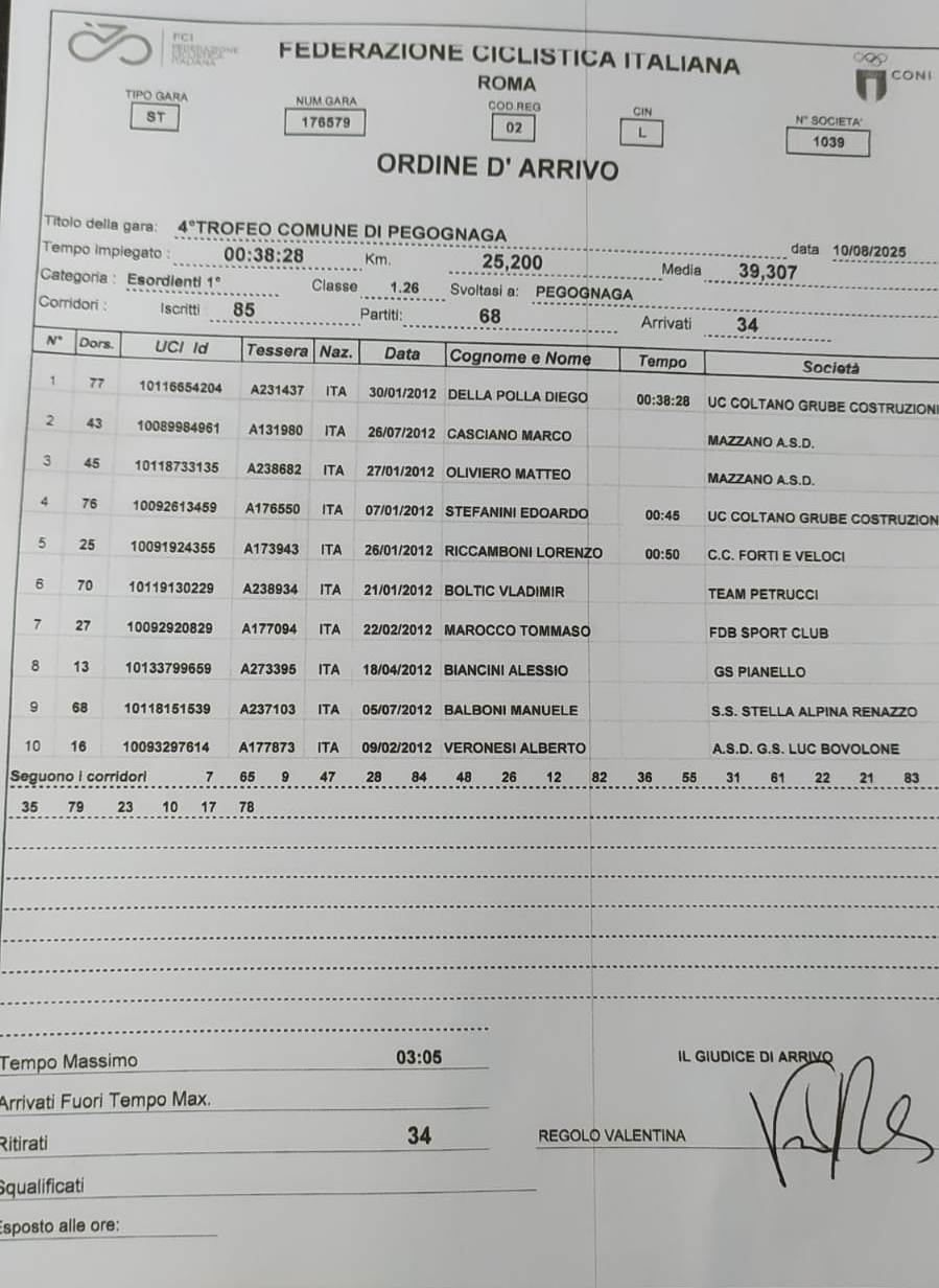1)Diego Della Polla (UC Coltano-Grube Costruzioni) km 25,2 in 38’28” media kmh. 39,307;