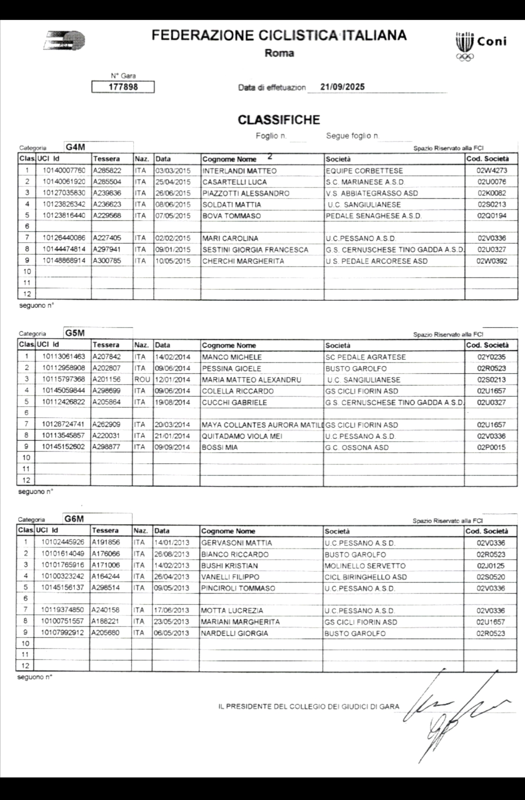Con questa pagina completiamo i servizi sulle gare “Giovanissimi”! di domenica 21 settembre 2025 a Pessano con Bornago in Provincia di Milano.