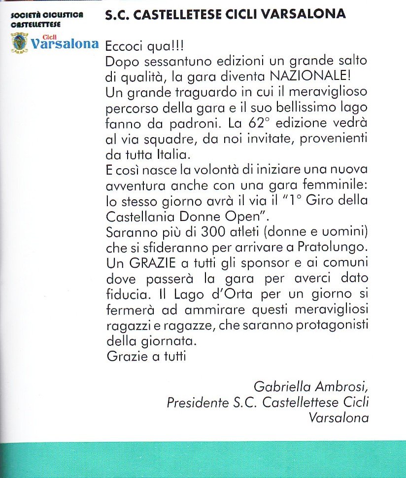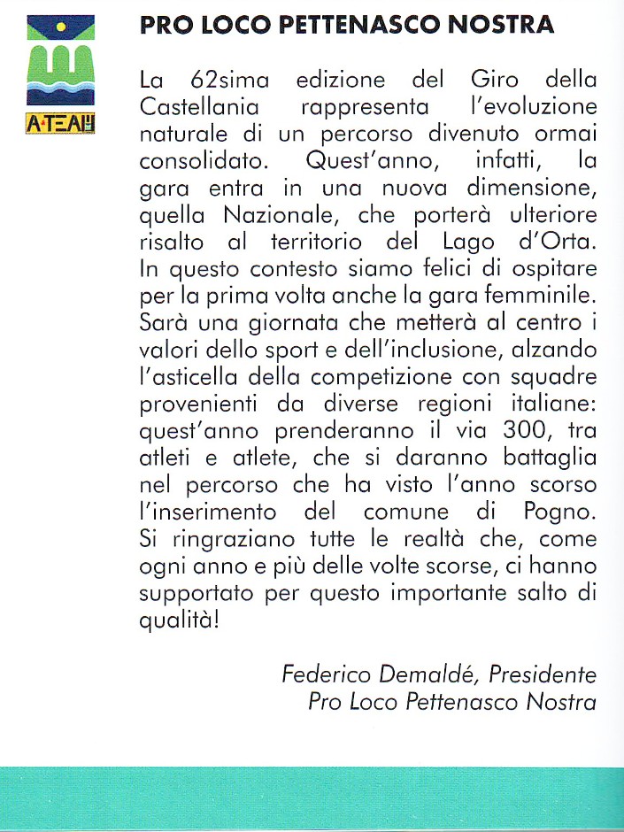 Nella bellissima location dell’Hotel Giardinetto splendido balcone sul Lago D’Orta in località Pettenasco, la Società Ciclistica Castellettese-Cicli Varsalona ha presentato ufficialmente l’edizione nr. 62 del Giro della Castellania, gara ciclistica riservata alla categoria Juniores di valenza Nazionale.