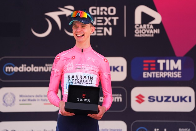 Maglia Rosa, leader della Classifica Generale, sponsorizzata da Mimit – Ministero delle Imprese e del Made in Italy – Jakob Omrzel (Bahrain Victorious Development Team)