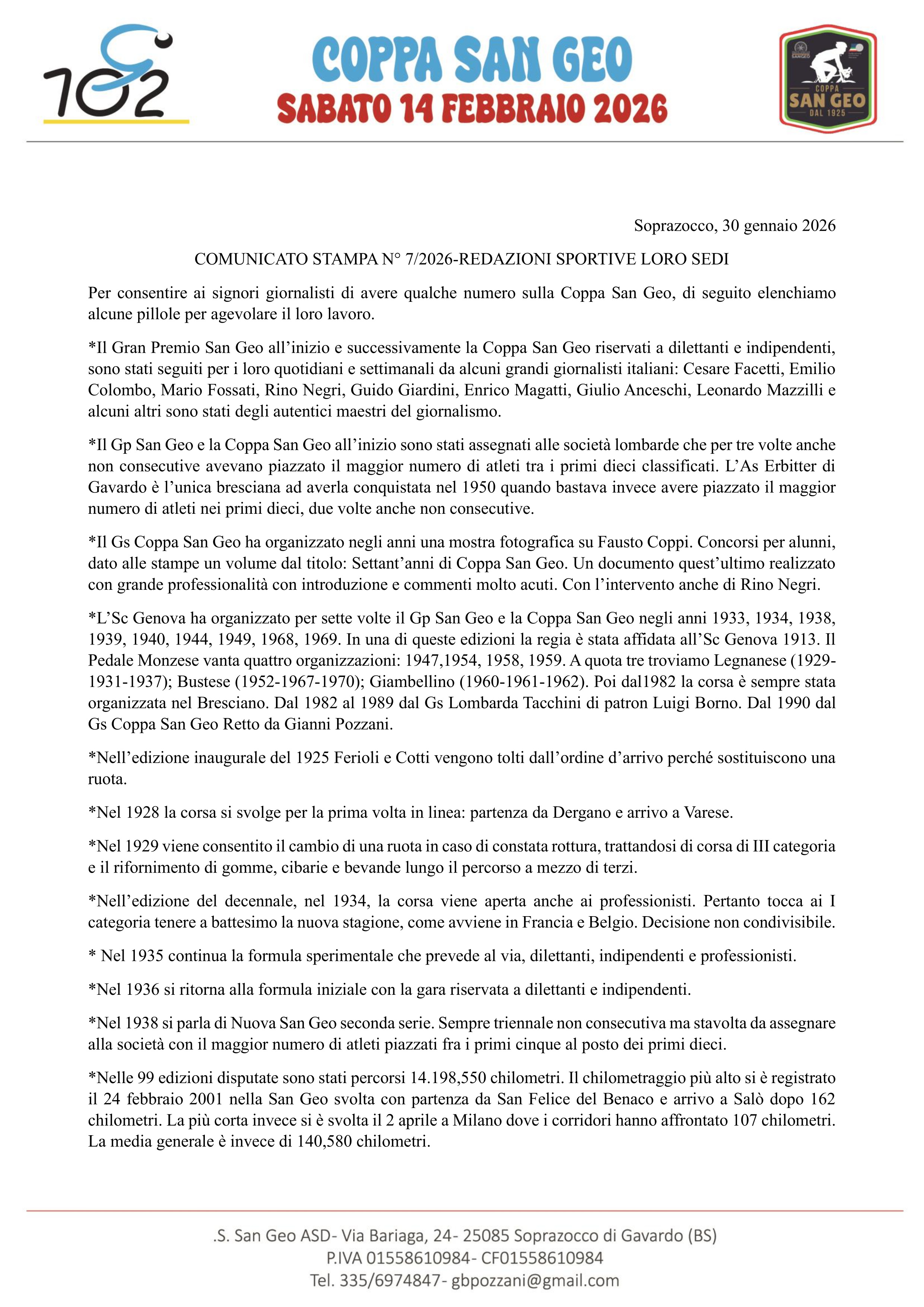 102° Coppa San Geo – Comunicato Stampa nr. 7