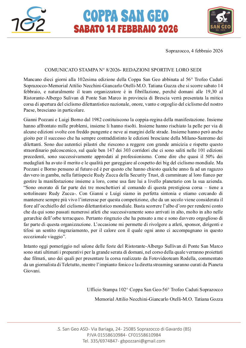 Domani giovedì 5 Febbraio presentazione ufficiale della 102° Coppa San Geo