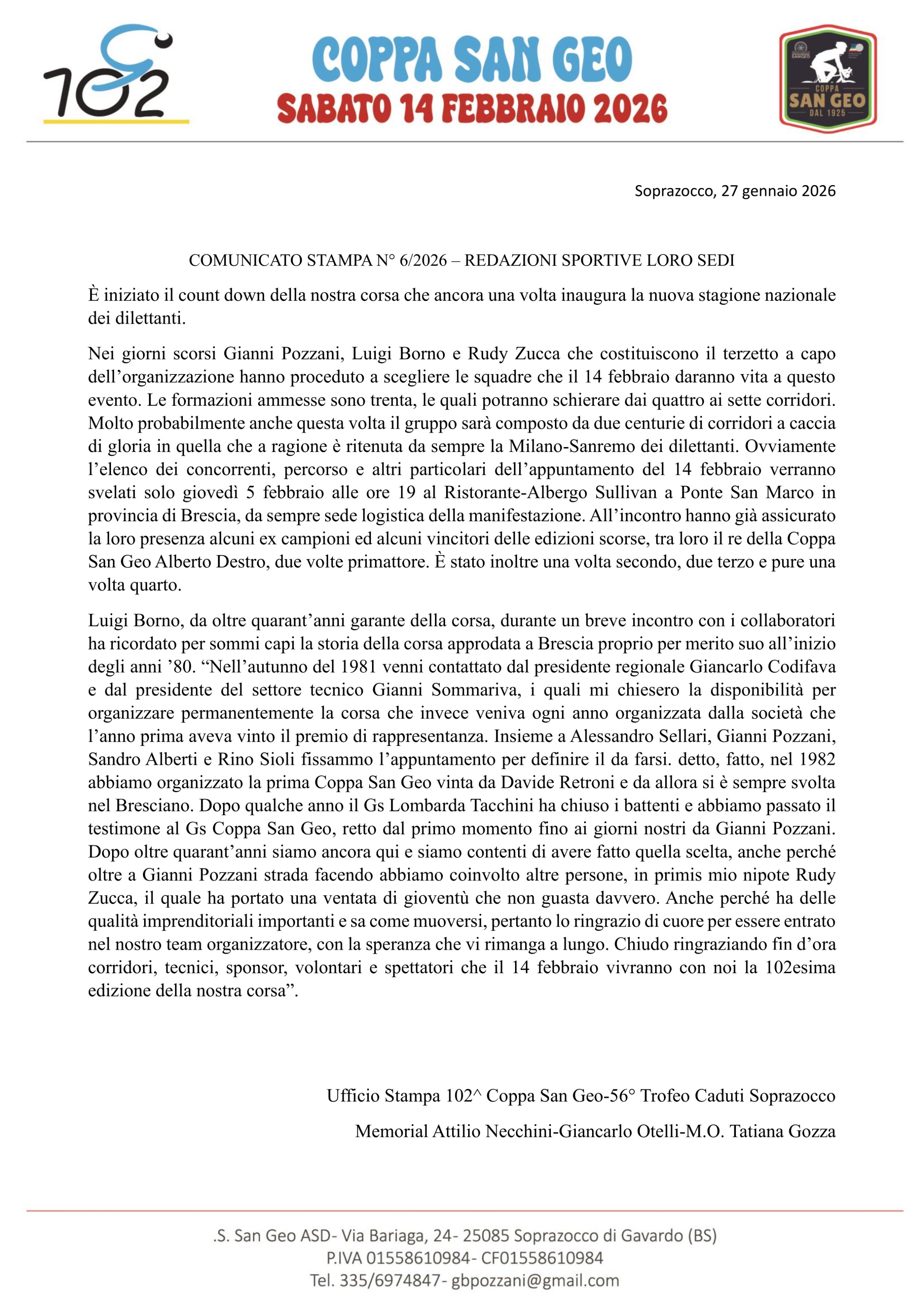 Comunicato Stampa nr. 6 102° Coppa San Geo