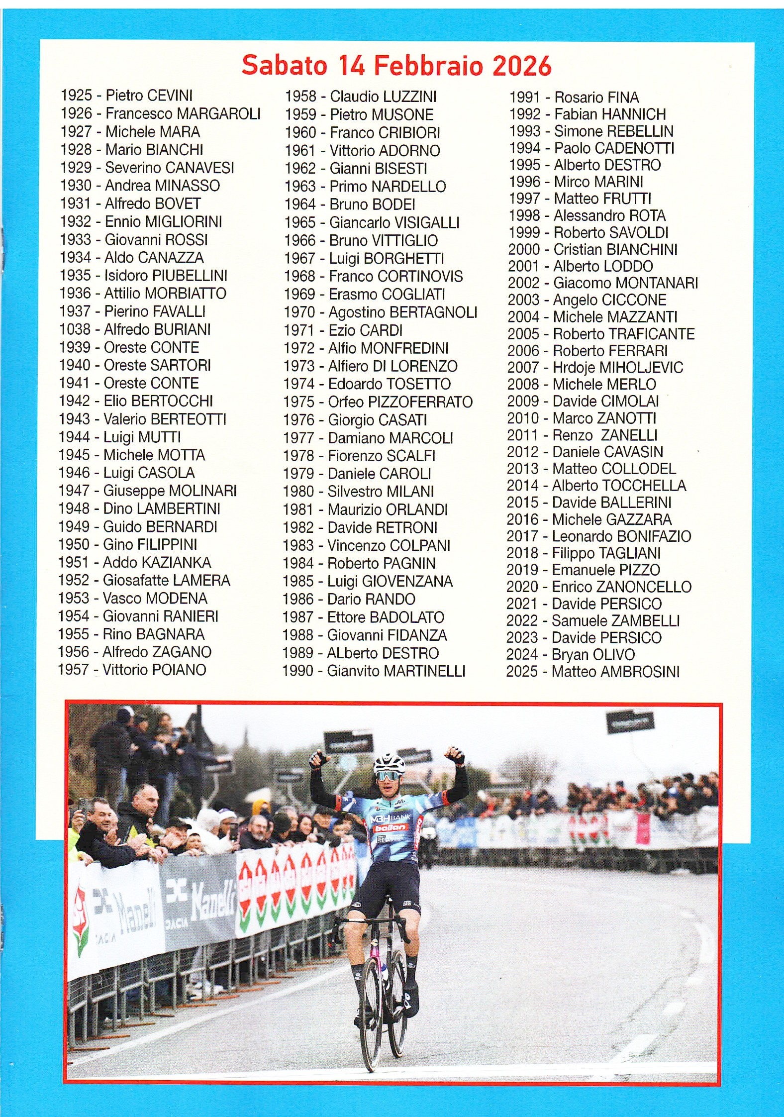 Pubblichiamo anche l’Albo d’Oro di quella che è anche conosciuta coma la “Sanremo dei Dilettanti” e che anche quest’anno come da tradizione, sarà la gara che alzerà idealmente il sipario sulla stagione agonistica 2026.