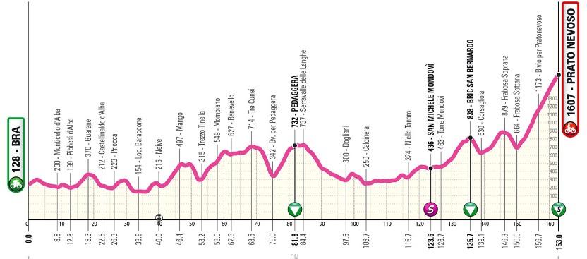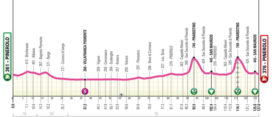Tappa mista con alcune salite anche impegnative che potrebbero definire la classifica laddove ci fossero distacchi ridotti tra i ciclisti. Dopo una prima parte a sud di Pinerolo ci si porta verso la Val di Susa svoltando a Piossasco verso Pinerolo. Dopo un primo passaggio sulla linea di arrivo iniziano due giri di circuito che scalano successivamente Prarostino dal suo versante più difficile (fino al 20%) e il muro in pavé di via dei Principi di Acaja che al secondo passaggio si troverà a pochi chilometri dall’arrivo.