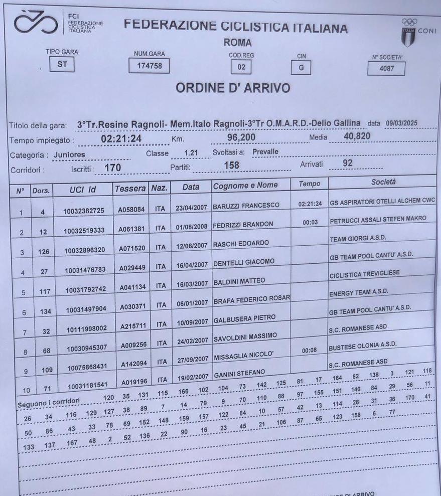 Da sottolineare che la Squadra di Busto Arsizio era priva di Riccardo Colombo e Matteo Turconi che lunedì gareggeranno nella cronoindividuale che, tradizionalmente si disputa sullo stesso percorso di quella che inaugura la Tirreno-Adriatico dei professionisti a Lido di Camaiore ma anche senza Alessandro Costa operato allo scafoide ed in convalescenza.