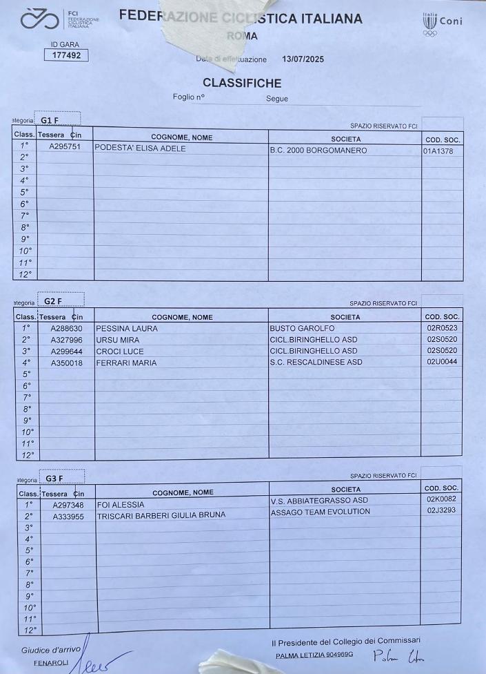 Classifiche femminili gara di Rescaldina domenica 13 luglio 2025