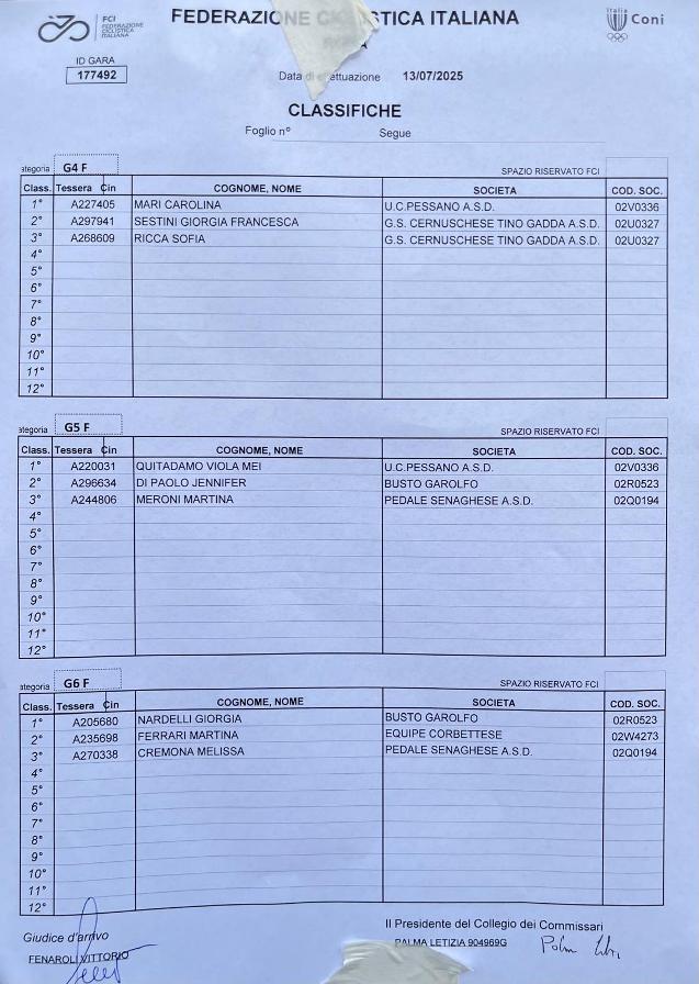 Tanto bell’agonismo anche tra le G4-F con Carolina Mari (UC Pessano) che precede il tandem del G.S. Cernuschese Tino Gadda nell’ordine, Francesca Giorgia Sestini e Sofia Ricca che completano il podio.