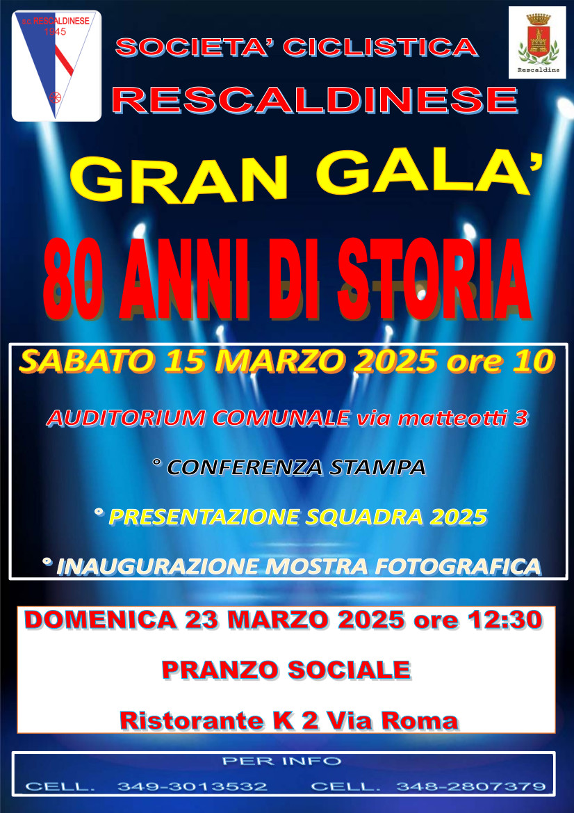 Sabato 15 Marzo 2025 la SC Rescaldinese 1945 presieduta da Osvaldo Forlani festeggia l’80° di Fondazione con una conferenza stampa nel corso della quale verranno presentati i Corridori tesserati per la Rescaldinese 1945, illustrati i programmi agonistici della stagione appena iniziata e verrà inaugurata anche la Mostra Fotografica.