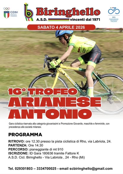 Organizzazione ella Ciclistica Biringhello di Rho col presidente Pietro Cacciamani in cabina di regia e i suoi collaboratori “gialloverdi” posizionati su tutto il circuito della Pista di Via Labriola a Rho, si è disputato il 16° Trofeo Antonio Arianese A.M. con la partecipazione di 179 ciclisti di entrambi i sessi della categoria “Giovanissimi” provenienti da tutta la Lombardia e dal Piemonte che hanno dato alla competizione sportiva quell’integratore di entusiasmo e voglia di confrontarsi cavallerescamente con tutti gli avversari coinvolgendo nell’agone del tifo le centinaia di persone presenti a bordo pista che incitavano calorosamente i loro beniamini ma che non hanno disdegnato applausi e incitamenti a tutti i concorrenti con i quali si è congratulato anche il Presidente della Federciclismo milanese Luca Arrara.