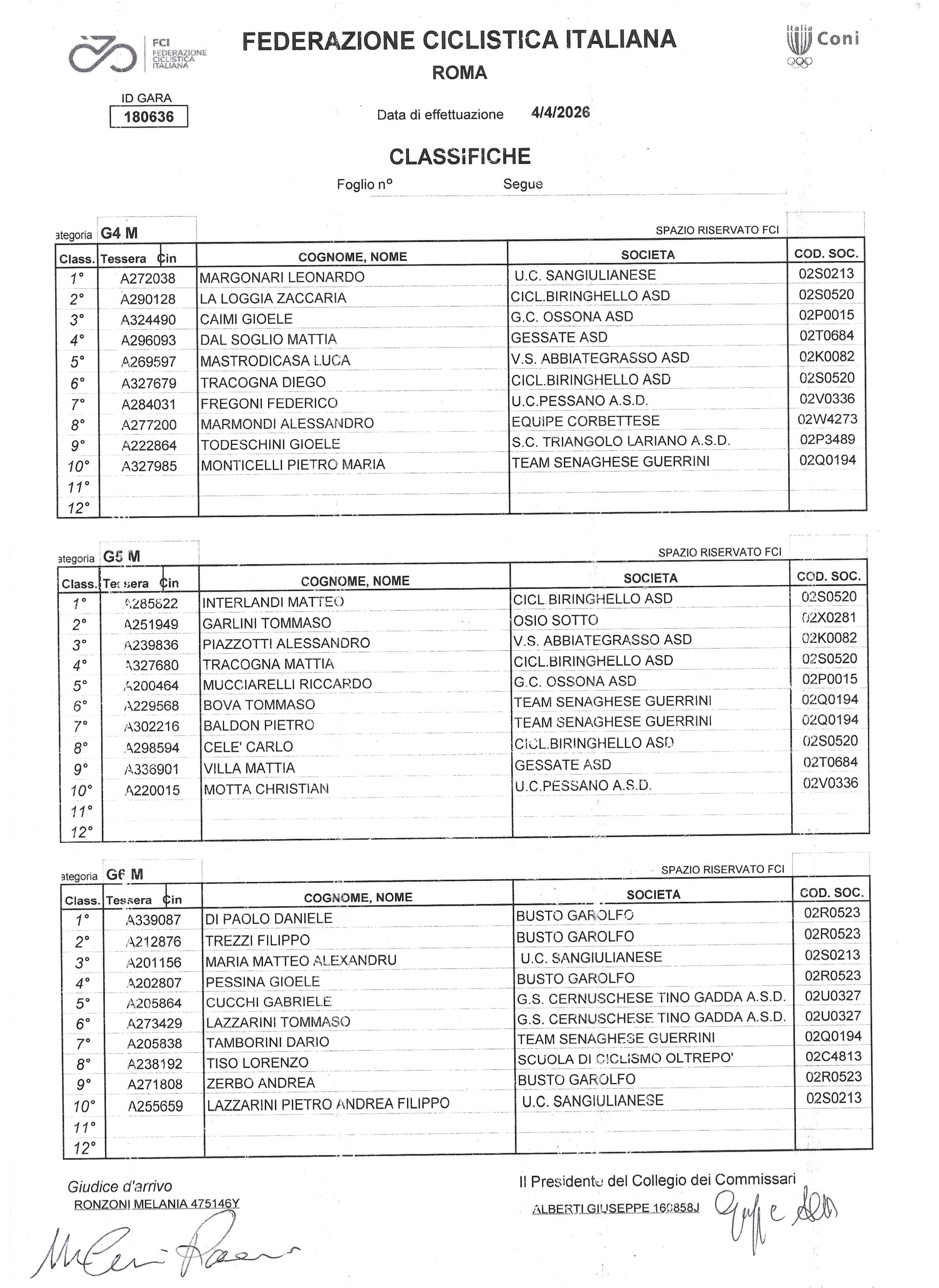 G2, 1) Giacomo Brienza (Ciclistica Biringhello); 2) Antonio Giona Sciascia (Corbettese); 3) Samuele Sposito (Senaghese-Guerrini); 4) Thomas Bergamaschi (Cernuschese); 5) Francesco Perronace (GC Ossona); 6) Diego Giacalone (Pol. Besanese). Donne G2, 1) Matilde Fuccello (Dairaghese); 2) Gaia Favata (Busto Garolfo); 3) Carlotta Pilotto (Sommese); 4) Antonella Perronace (GC Ossona).
