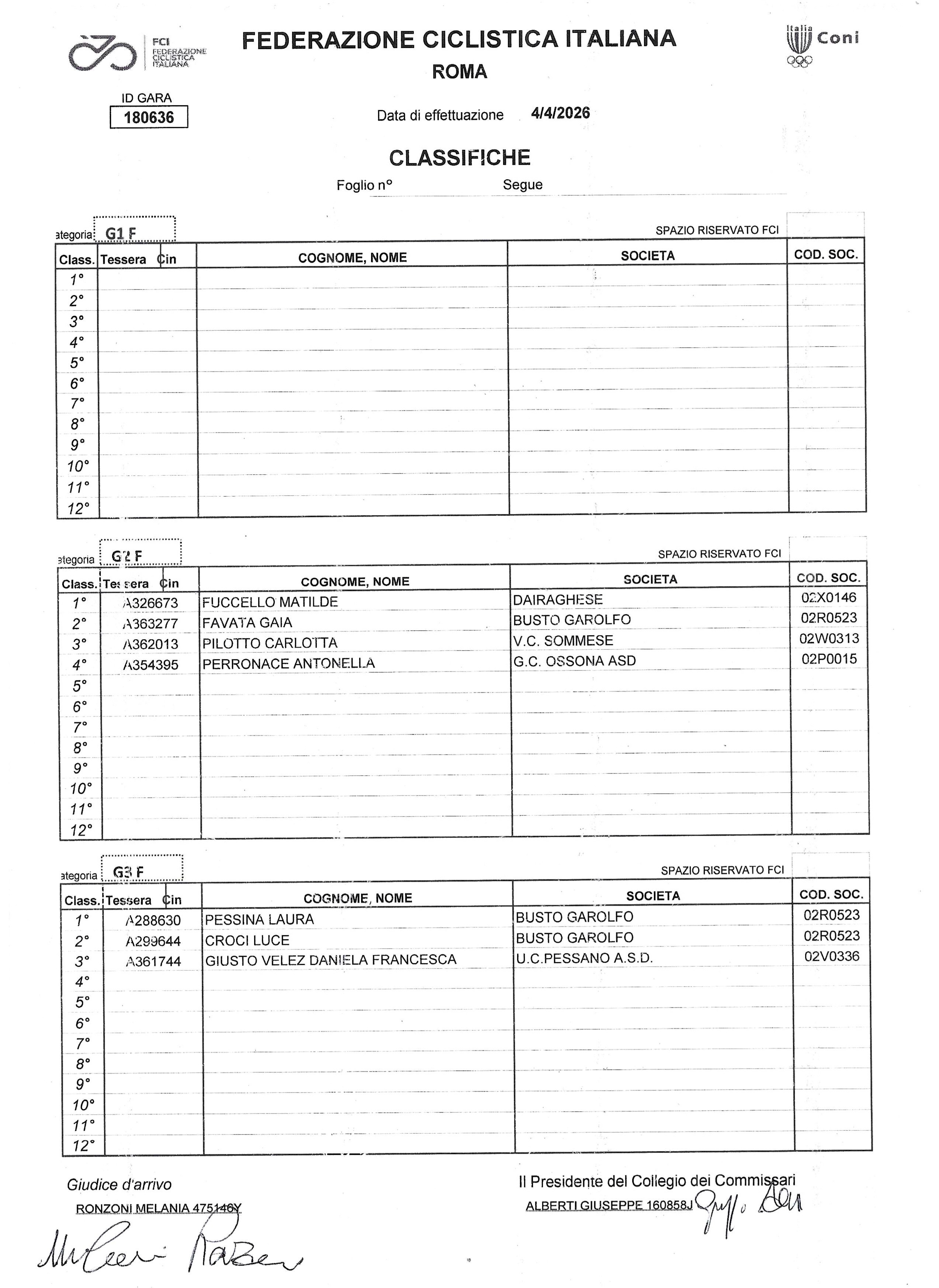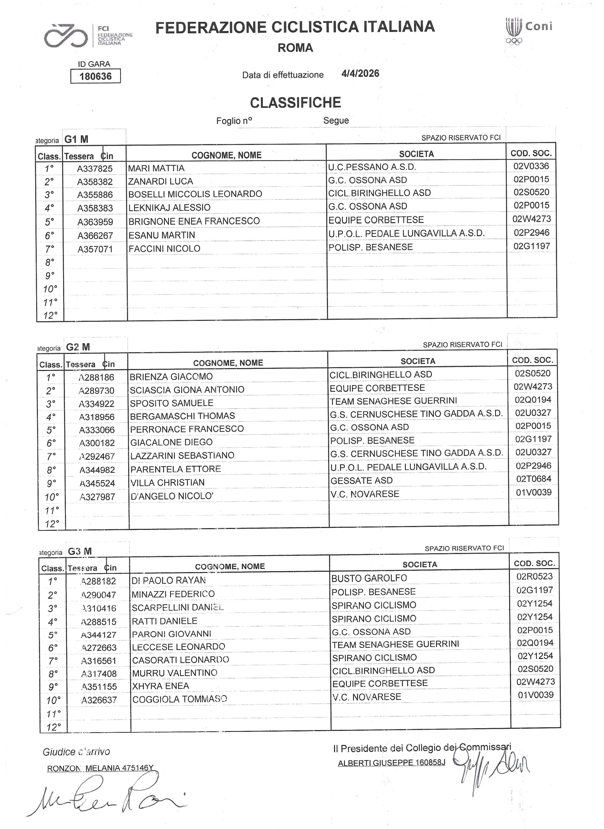 G3, 1) Rayan Di Paolo (Busto Garolfo); 2) Federico Minazzi (Pol.Besanese); 3) Daniel Scarpellini (Spirano Ciclismo); 4) Daniele Ratti (Spirano Ciclismo); 5) Giovanni Paroni (GC Ossona); 8) Valentino Murru (Biringhello); 9) Enea Xhyra (Corbettese). Donne G3, 1) Laura Pessina (Busto Garolfo); 2) Luce Croci (Busto G); 3) Francesca Daniela Velez Giusto (Pessano).