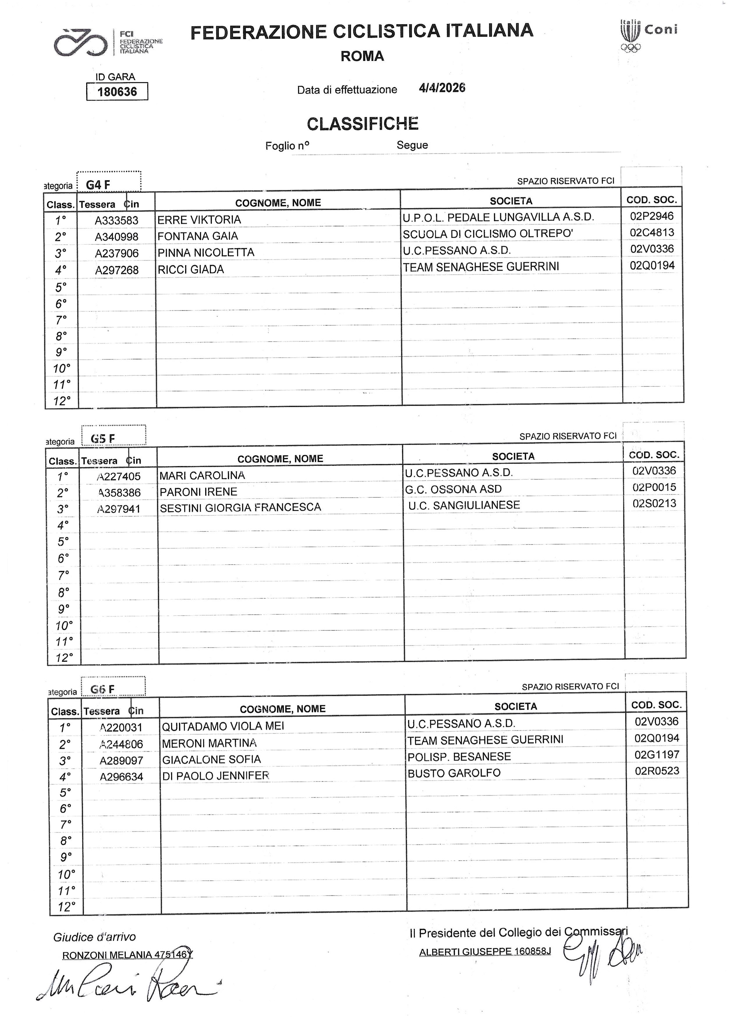 G4 1) Leonardo Margonari (UC Sangiulianese); 2) Zaccaria La Loggia (Biringhello); 3) Gioele Caimi (Ossona); 4) Mattia Dal Soglio (Gessate); 5) Luca Mastrodicasa (VS Abbiategrasso); 6) Diego Tracogna (Biringhello); 8) Alessandro Marmondi (Corbettese). Donne G4, 1) Viktoria Erre (Pedale Lungavilla); 2) Gaia Fontana (SC Oltrepò); 3) Nicoletta Pinna (Pessano); 4) Giada Ricci (Senaghese-Guerrini).