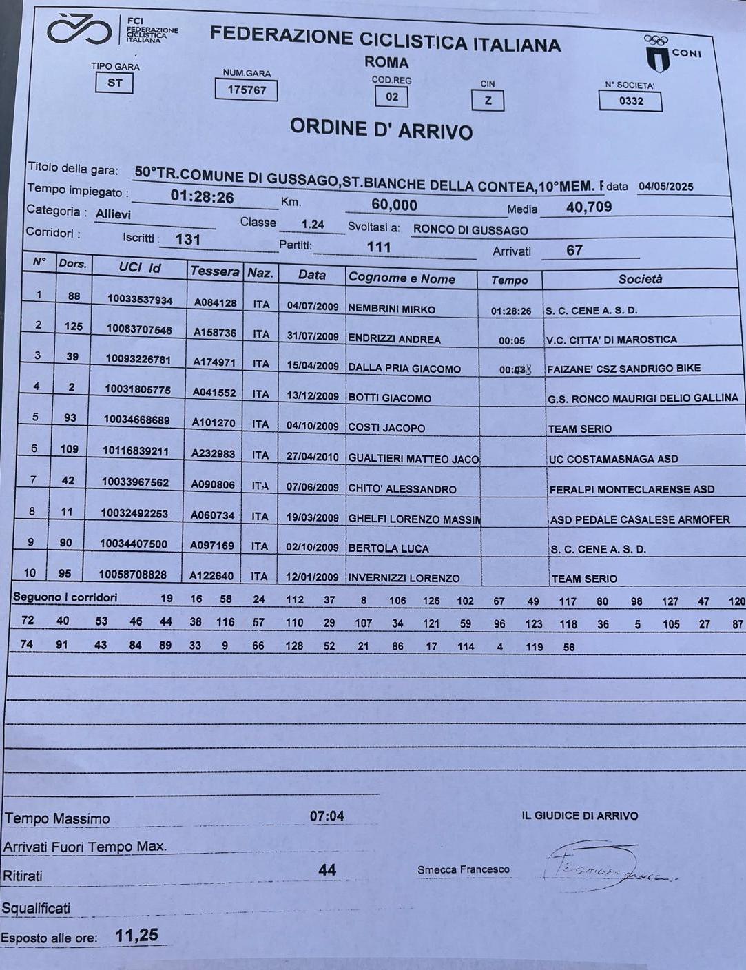 1)Mirko Nembrini (Scuola Ciclismo Cene) km 60 in 1h28’26” media kmh40,709; 2)Andrea Endrizzi (Velo Club Città di Marostica) a 05”; 3)Giacomo Dalla Pria (Faizanè Csz – Sandrigo Bike) a 23”; 4)Giacomo Botti (GS Ronco Maurigi-Delio Gallina); 5)Jacopo Costi (Team Serio); 6)Jacopo Matteo Gualtieri (UC Costamasnaga); 7)Alessandro Chitò (Feralpi Monteclarense); 8)Lorenzo Massimo Ghelfi (Pedale Casalese-Armofer); 9)Luca Bertola (Scuola Ciclismo Cene); 10)Lorenzo Invernizzi (Team Serio).-