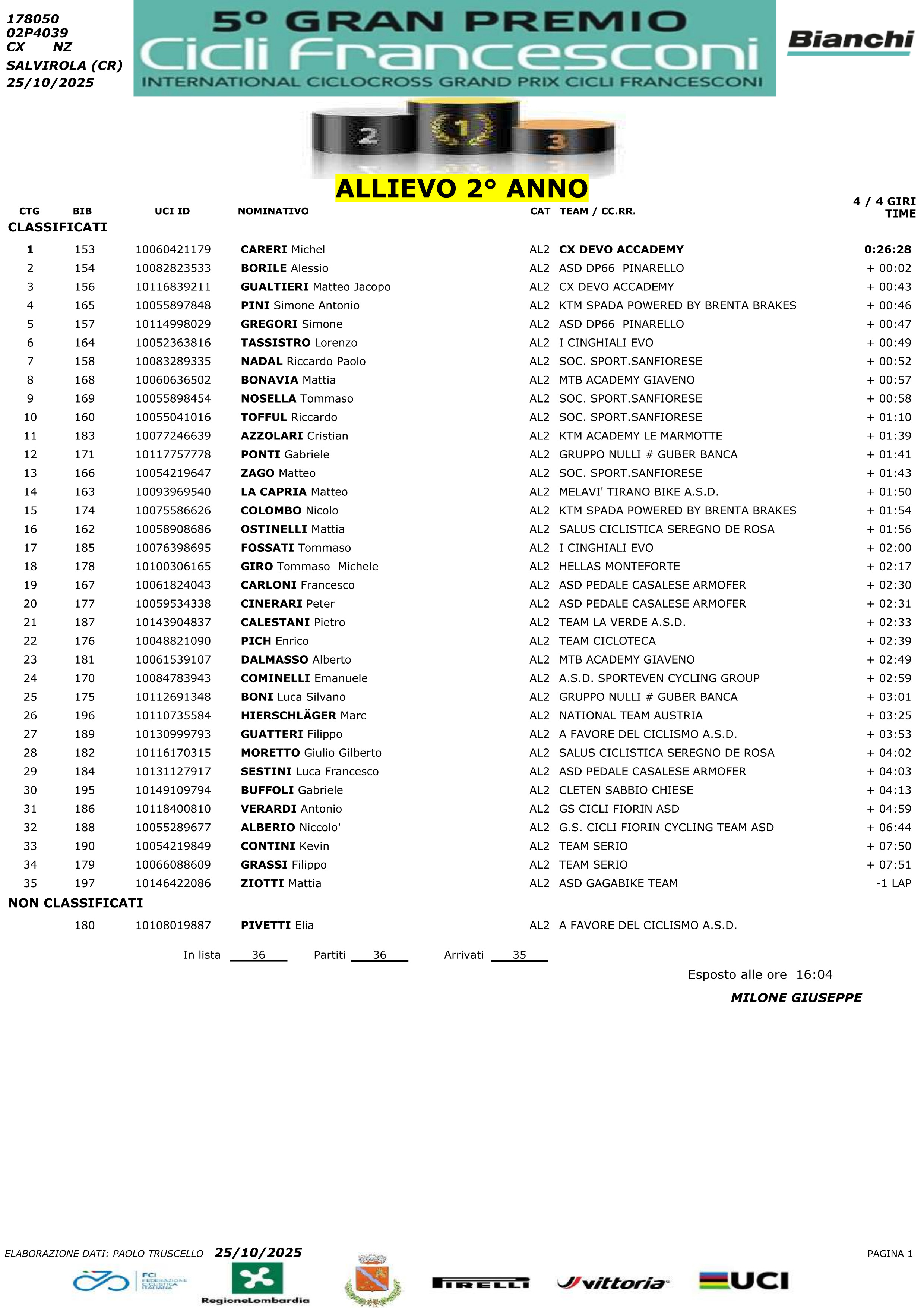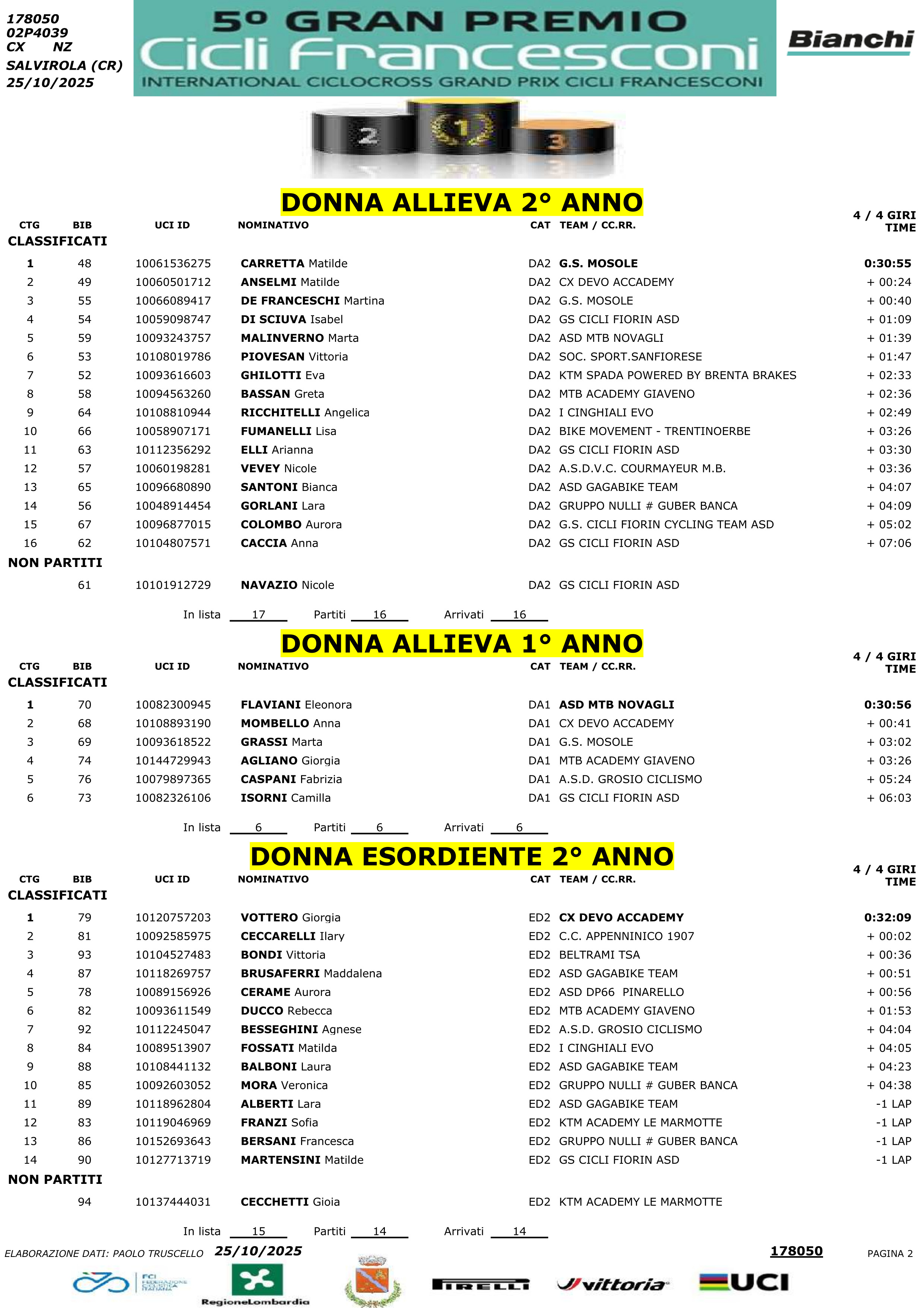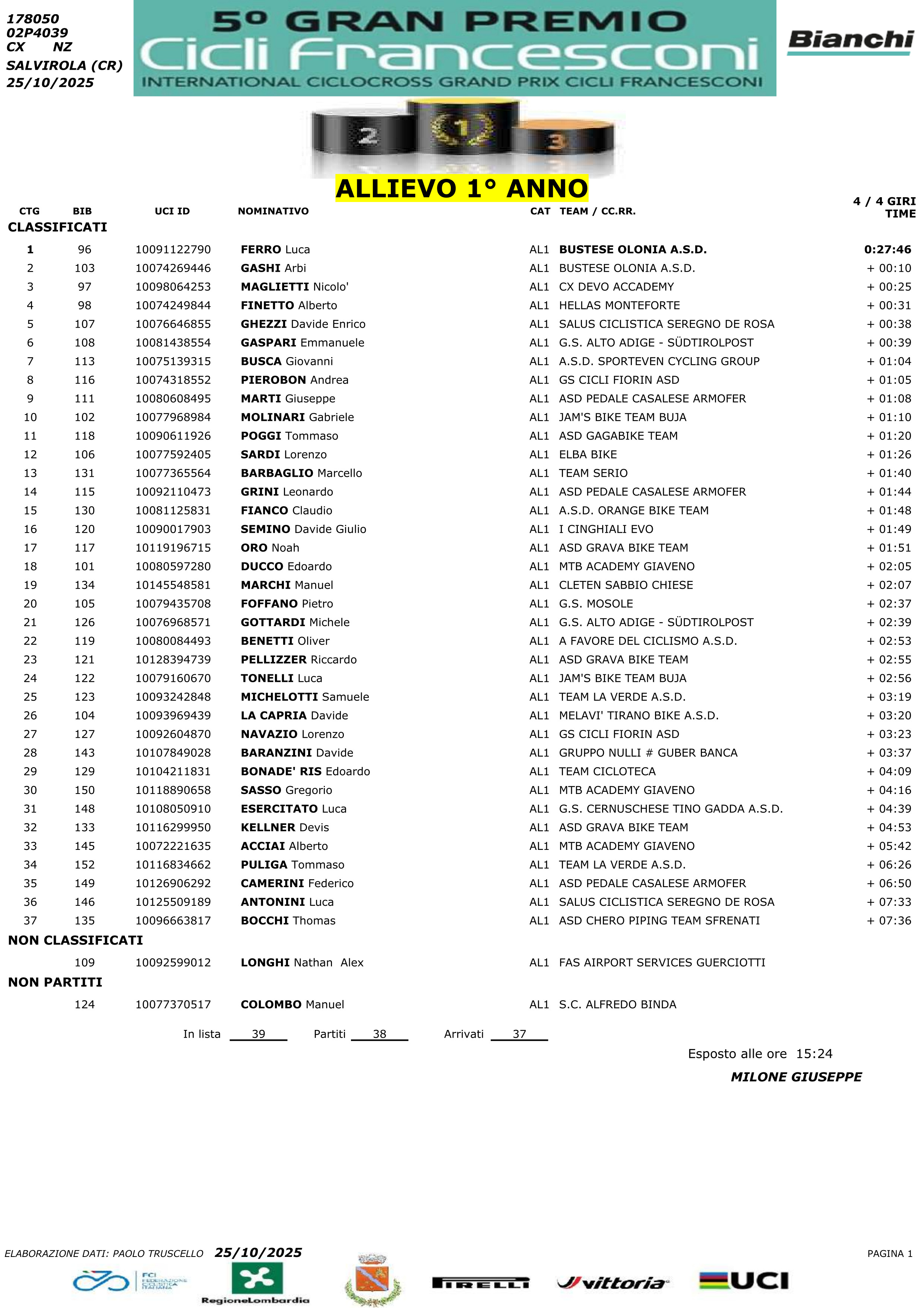 Luca Ferro in modo particolare coglie sempre l’attimo subito alla partenza, si mette in testa, stacca gli avversari e vola solitario al traguardo che poi taglia con distacchi via via superiori inflitti agli avversari e questo, dopo una stagione su strada anche quella piuttosto ricca di vittorie e piazzamenti sia per Luca Ferro che per gli altri due alfieri “Bustocchi”, Arbi Gashi e Cammarata.