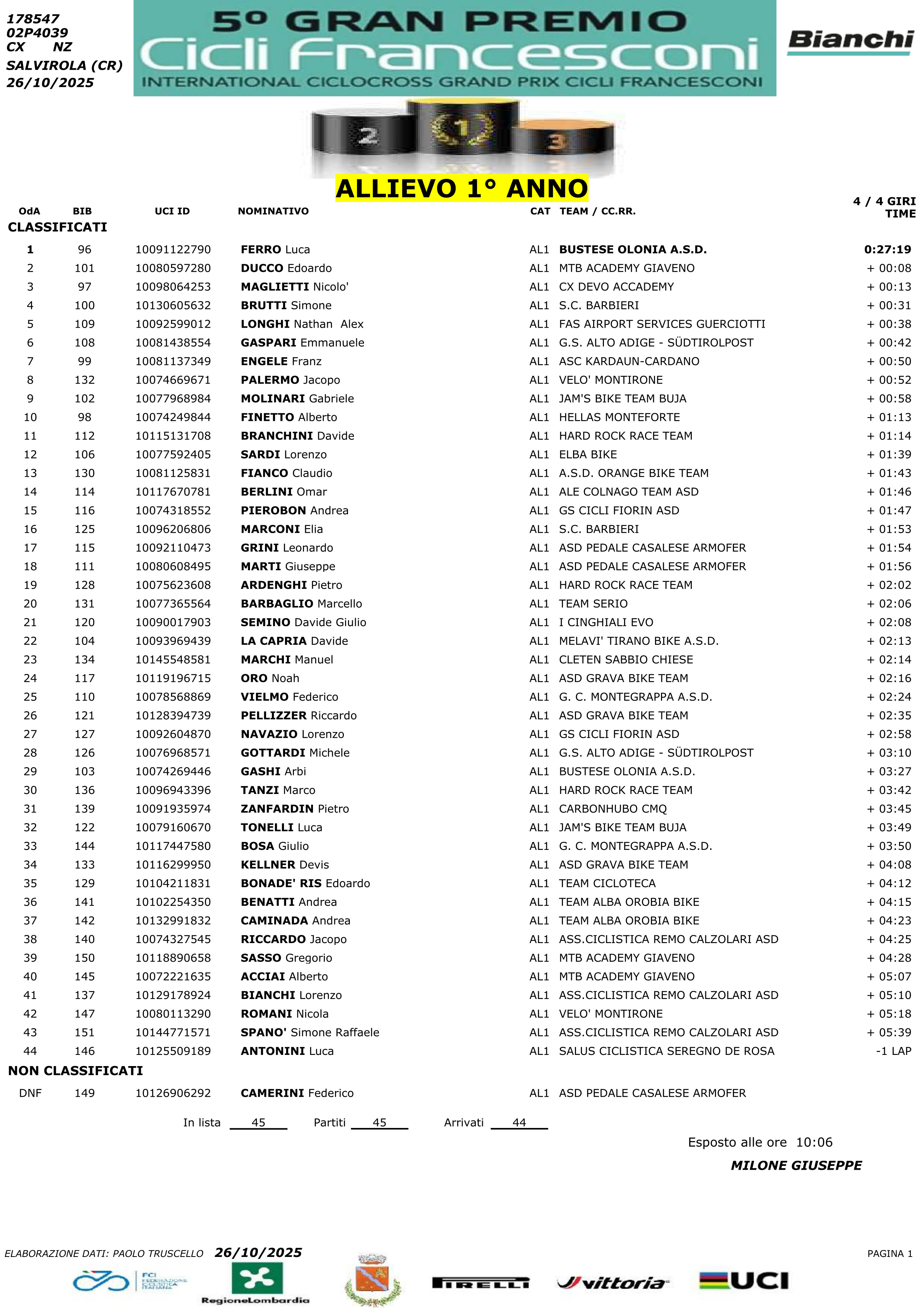 Una conferma su tutte, quella dell’Allievo 1° anno Luca Ferro (Bustese Olonia), che ha vinto entrambe le gare, quella di sabato 25 e quella di domenica 26 festeggiando in questa occasione il suo 14° compleanno. Alle spalle del “Mastino Bustocco”, Tricolore Esordienti 2° anno in Toscana a febbraio si è classificato il piemontese Edoardo Ducco della Mtb Academy-Giaveno.