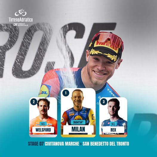 Milan è il primo corridore a vincere l’ultima tappa della Tirreno Adriatico per tre volte di fila da Alessandro Petacchi (2004-06).