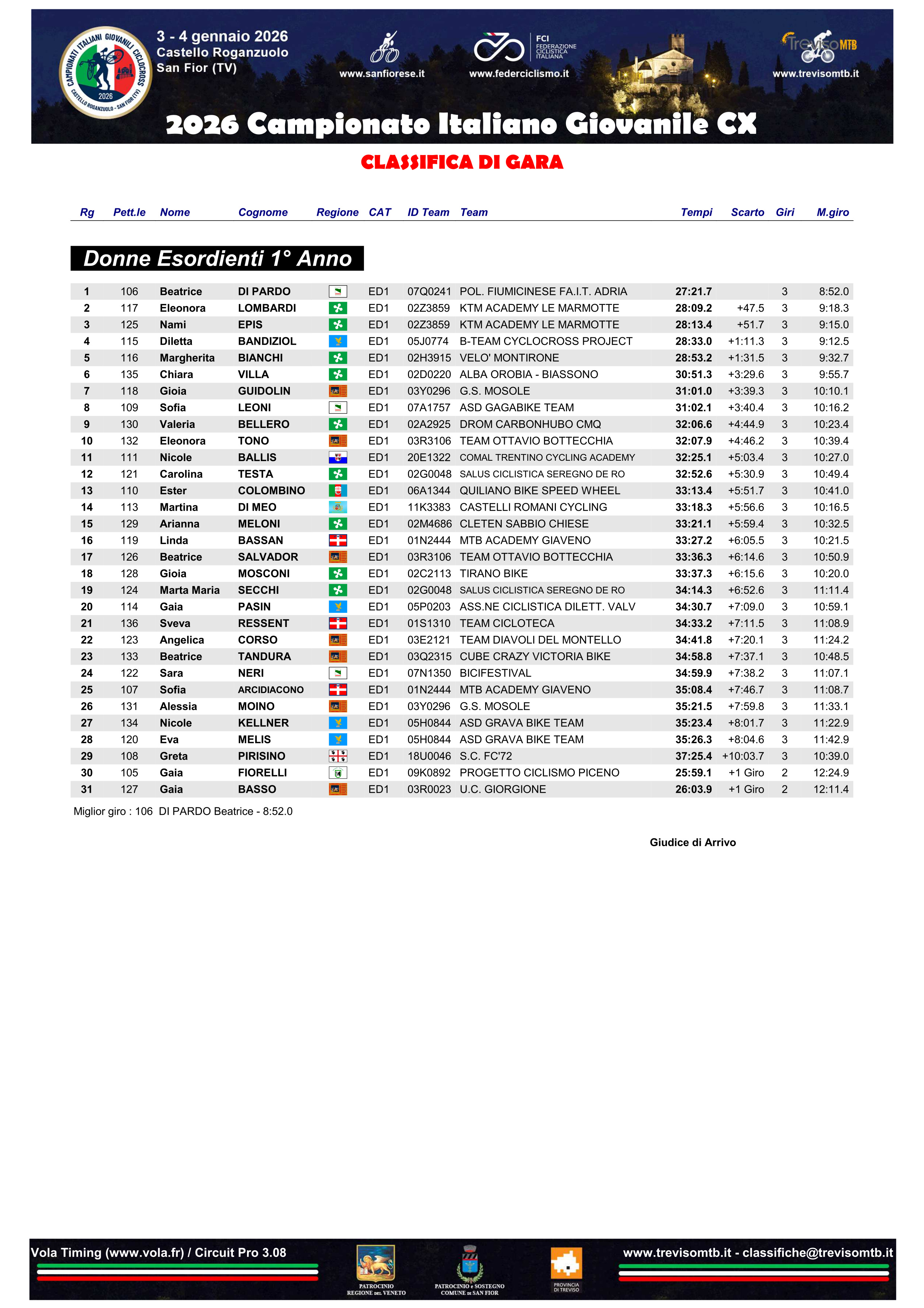 Beatrice Di Pardo, dodici anni di San Giovanni in Marignano vince a Castello di Roganzuolo, frazione di San Fior in provincia di Treviso, il Campionato Italiano CX Giovanili precedendo nettamente la coppia della Ktm Academy Le Marmotte Eleonora Lombardi e Nami Epis che completano così il podio Tricolore rispettivamente a 47″ e a 51″.