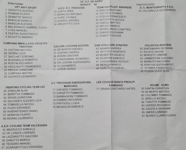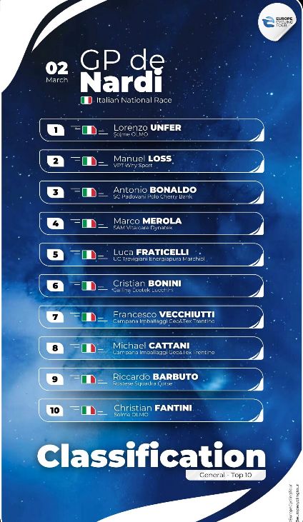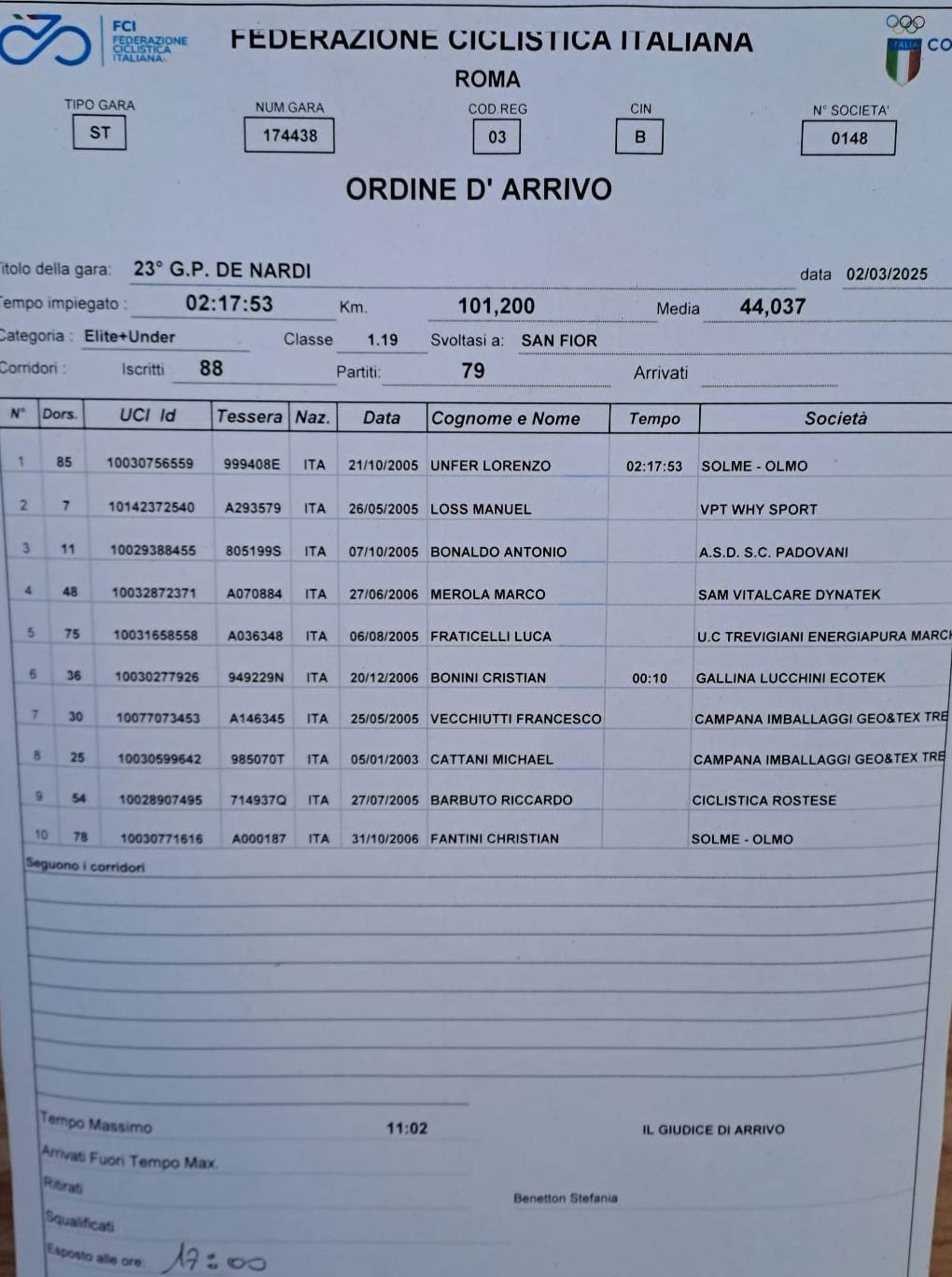 Corsa vinta da Lorenzo Unfer del Team, “Solme Olmo” che conquista così la prima vittoria stagionale si per la sua Squadra che personale e che ci teneva tantissimo a conquistare e che dedica alla sua Famiglia e alla sua Squadra che oggi, sono sue parole, ha corso in modo molto eccellente. Ci tenevo anche perchè lo scorso anno questa stessa corsa venne vinta da Simone Buda che, purtroppo, ha deciso di appendere la bici al chiodo.
